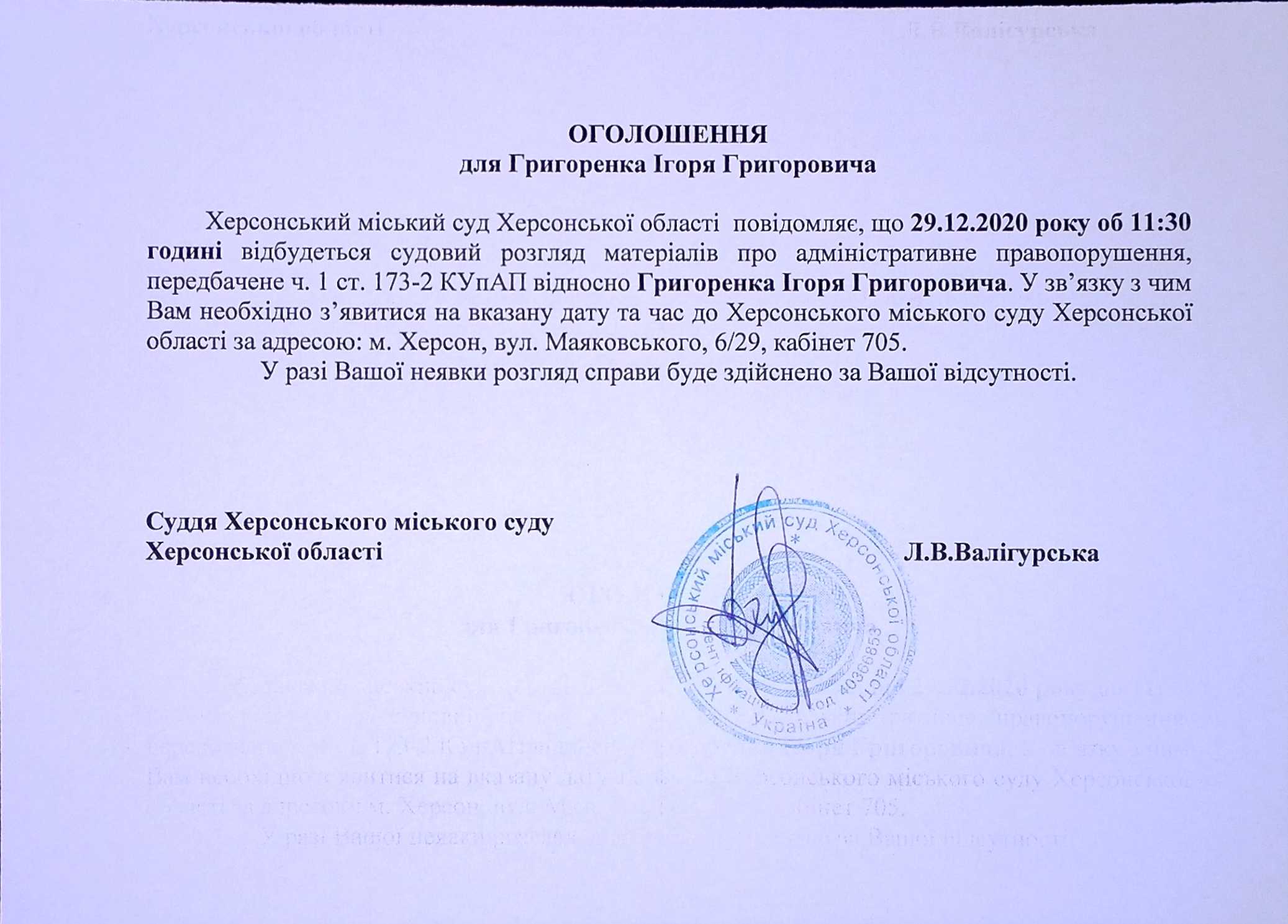 ОГОЛОШЕННЯ для Григоренка Ігоря Григоровича
