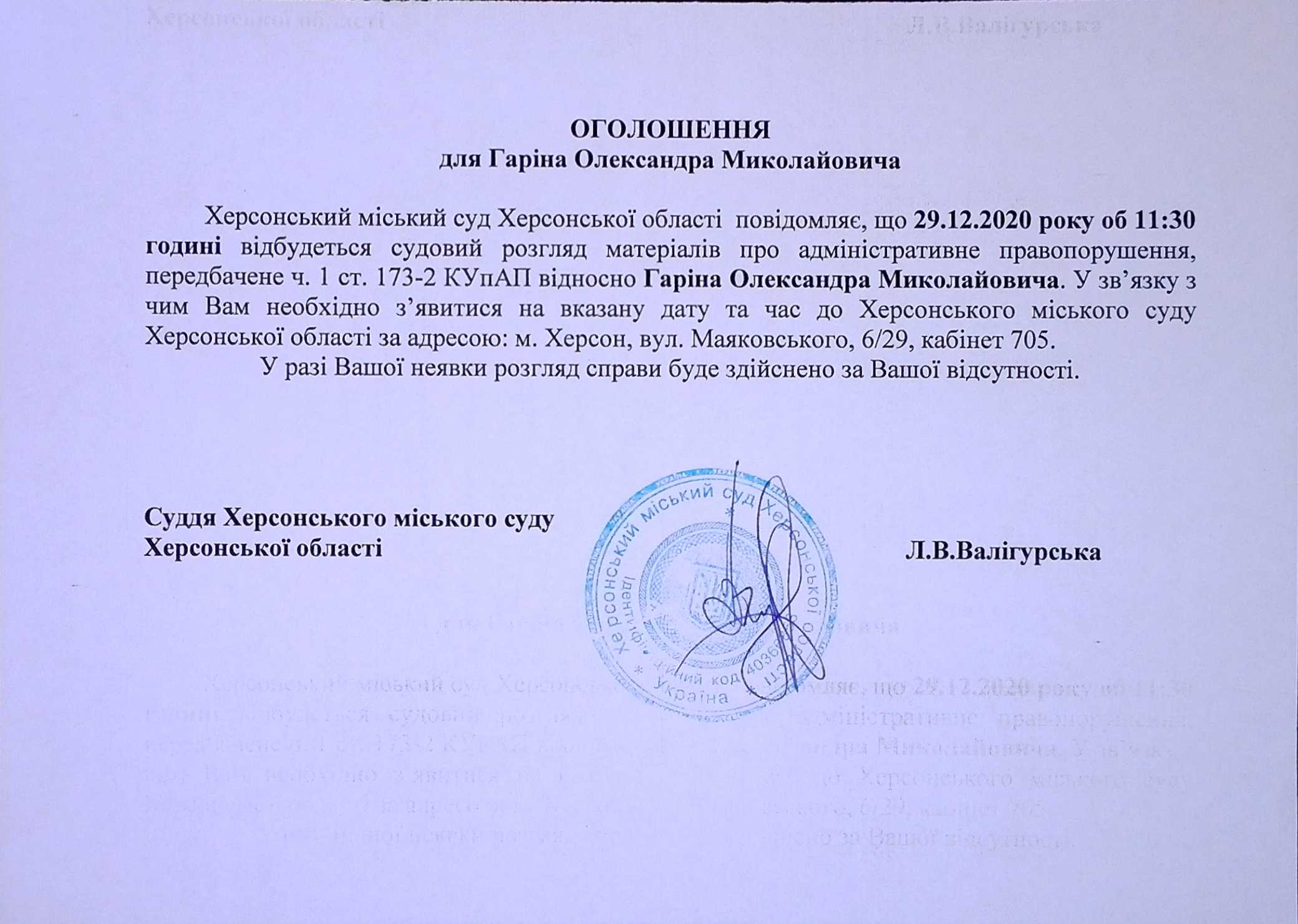 ОГОЛОШЕННЯ для Гаріна Олександра Миколайовича