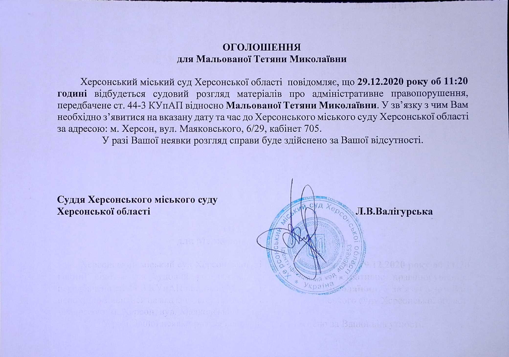 ОГОЛОШЕННЯ для Мальованої Тетяни Миколаївни