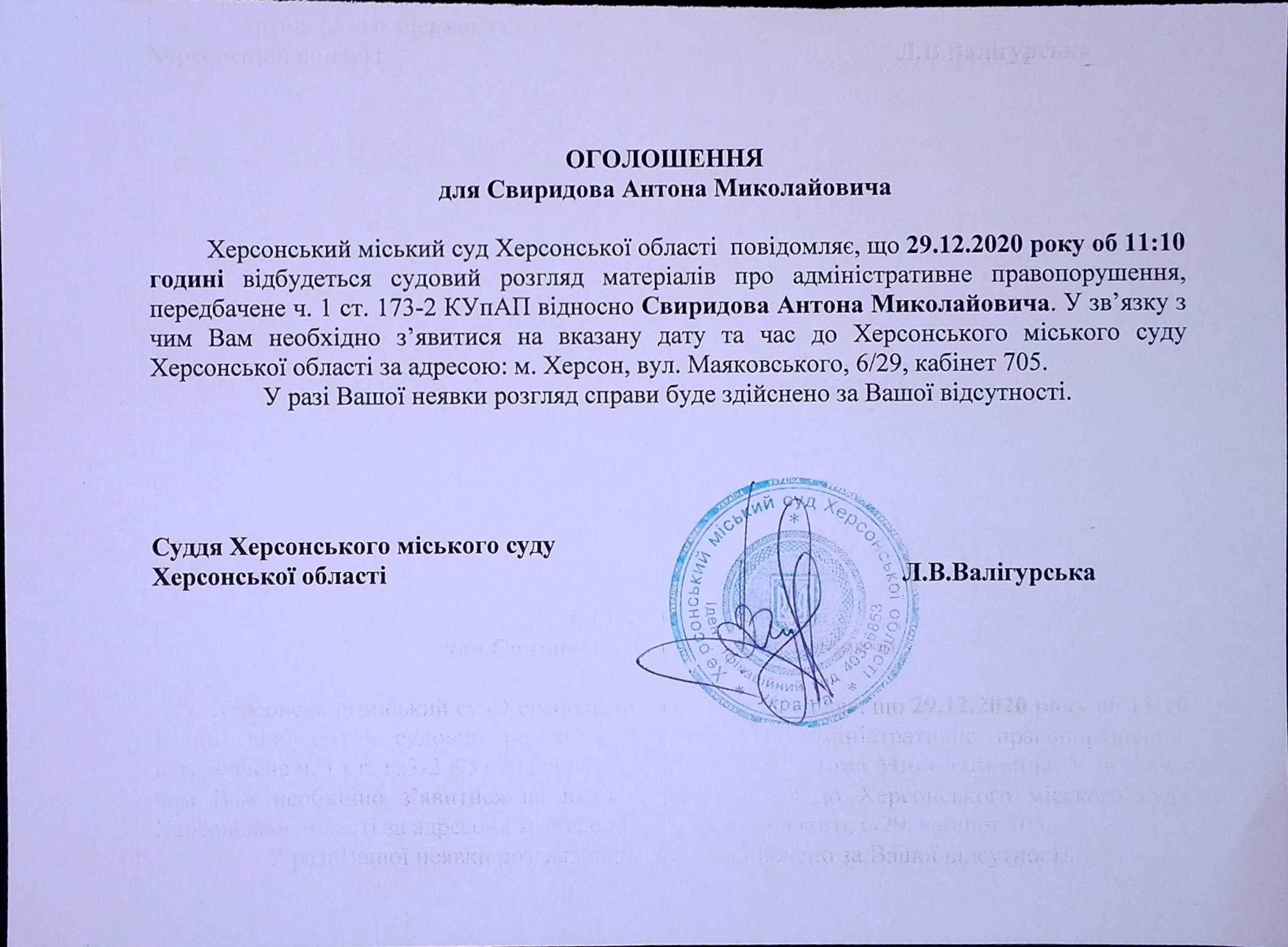 ОГОЛОШЕННЯ для Свиридова Антона Миколайовича