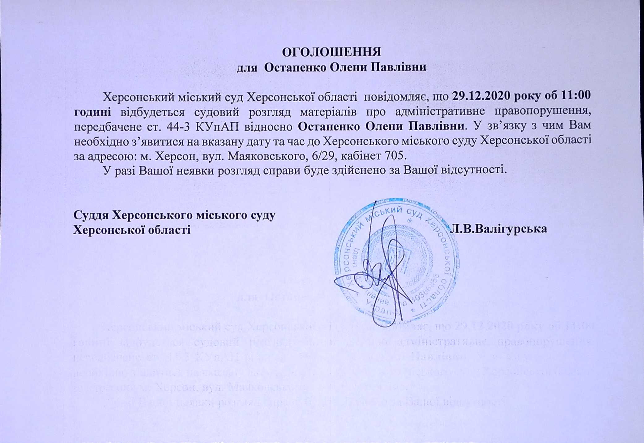 ОГОЛОШЕННЯ для Остапенко Олени Павлівни