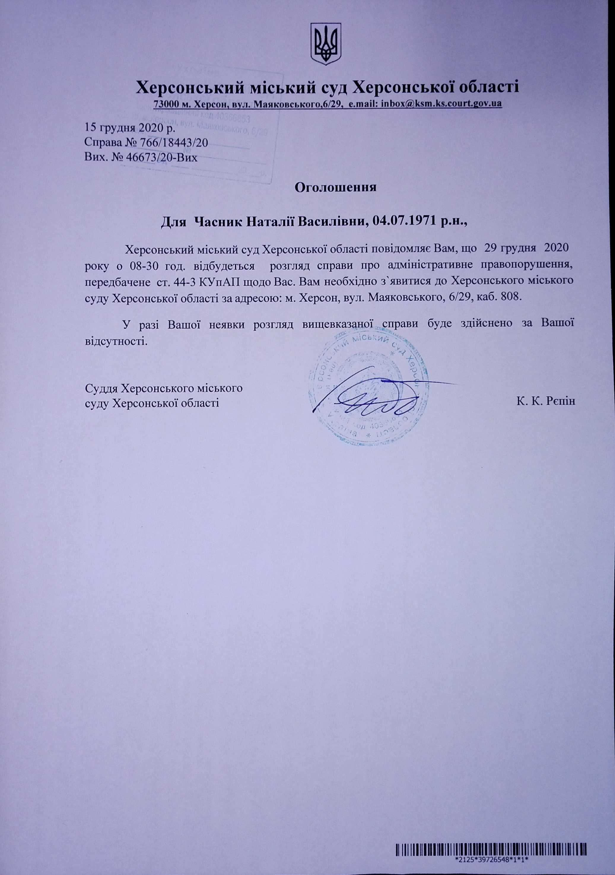 ОГОЛОШЕННЯ ПРО ВИКЛИК ДО СУДУ