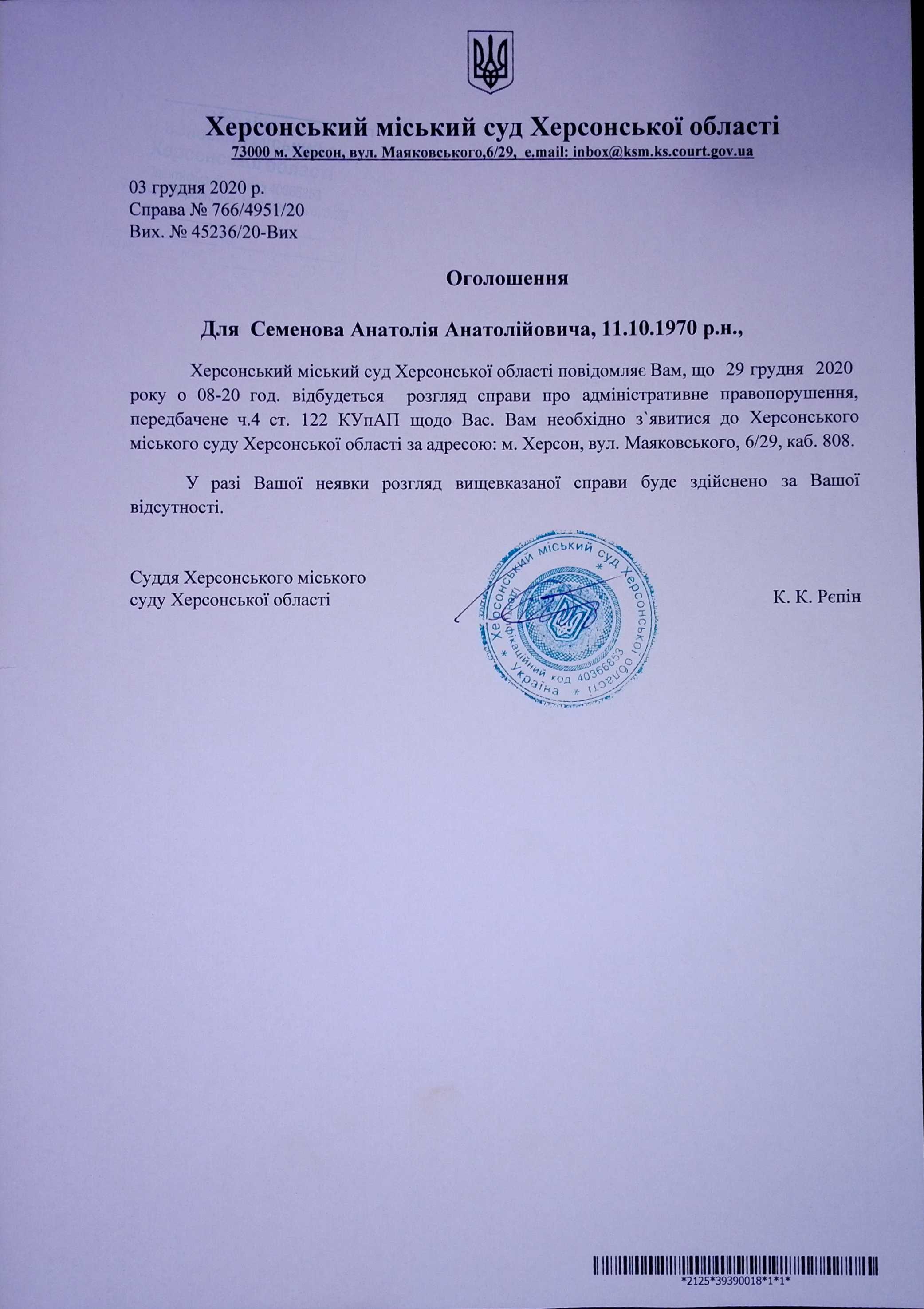 ОГОЛОШЕННЯ для Семенова Анатолія Анатолійовича