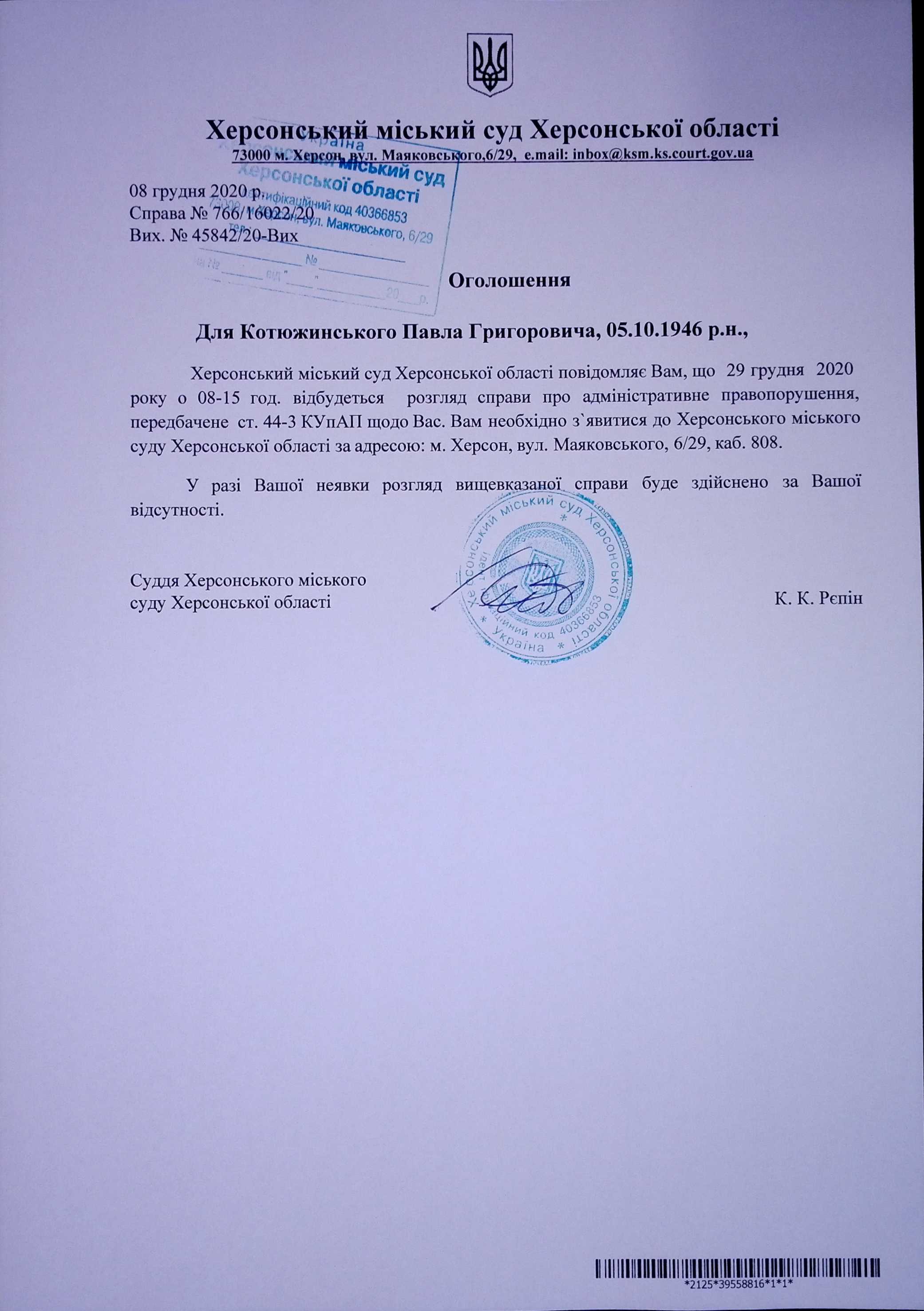 ОГОЛОШЕННЯ для Котюжинського Павла Григоровича