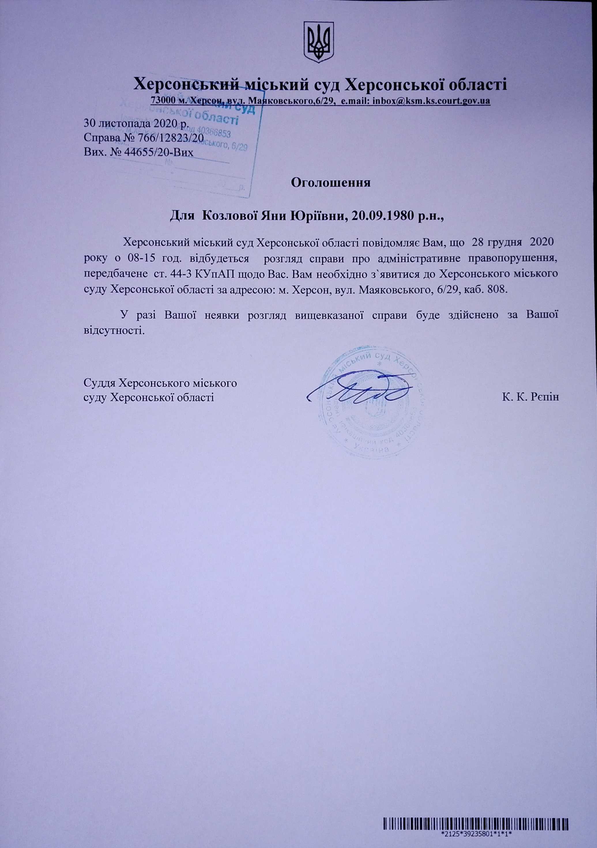ОГОЛОШЕННЯ для Козлової Яни Юріївни