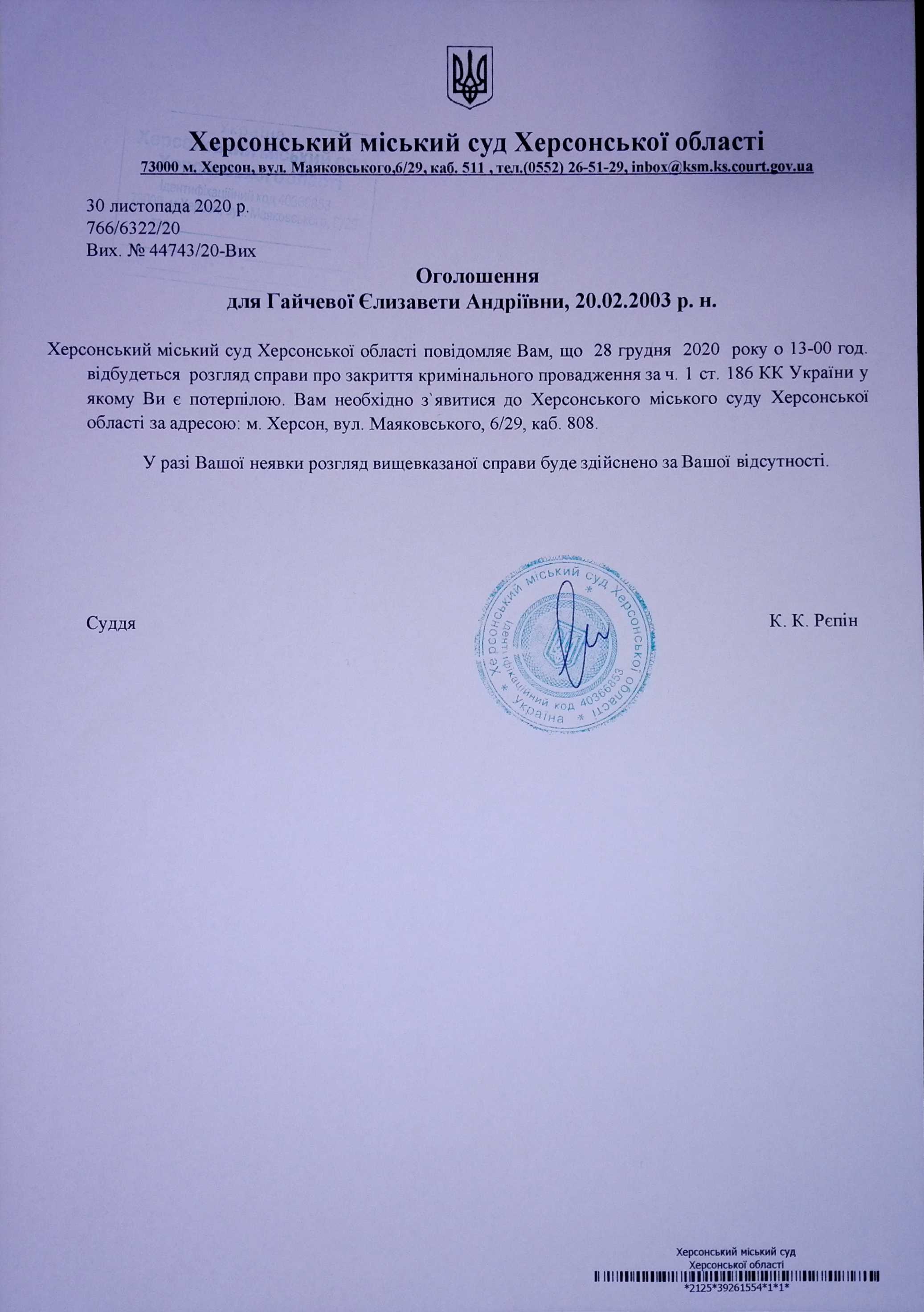 ОГОЛОШЕННЯ для Гайчевої Єлизавети Андріївни
