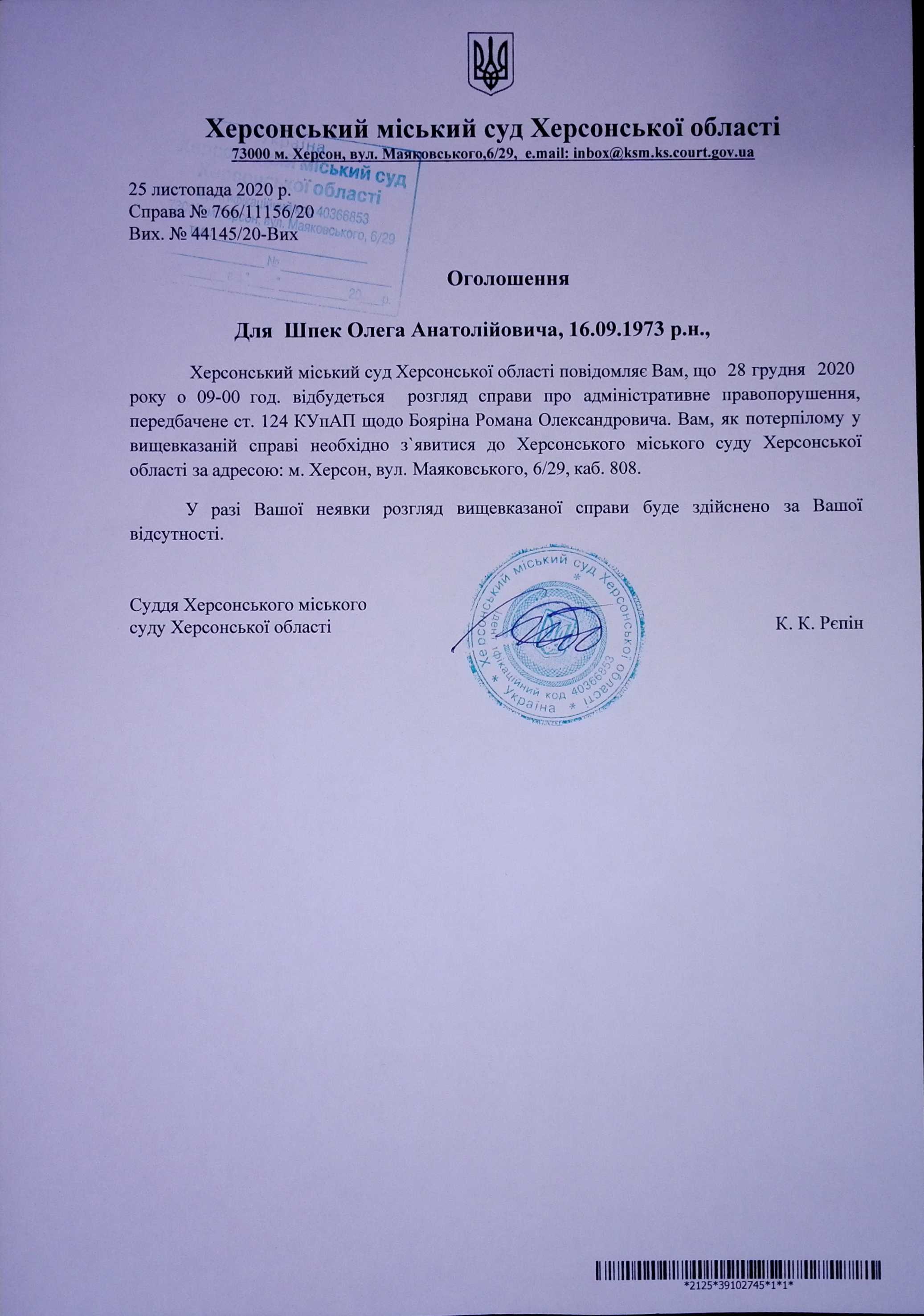 ОГОЛОШЕННЯ для Шпек Олега Анатолійовича