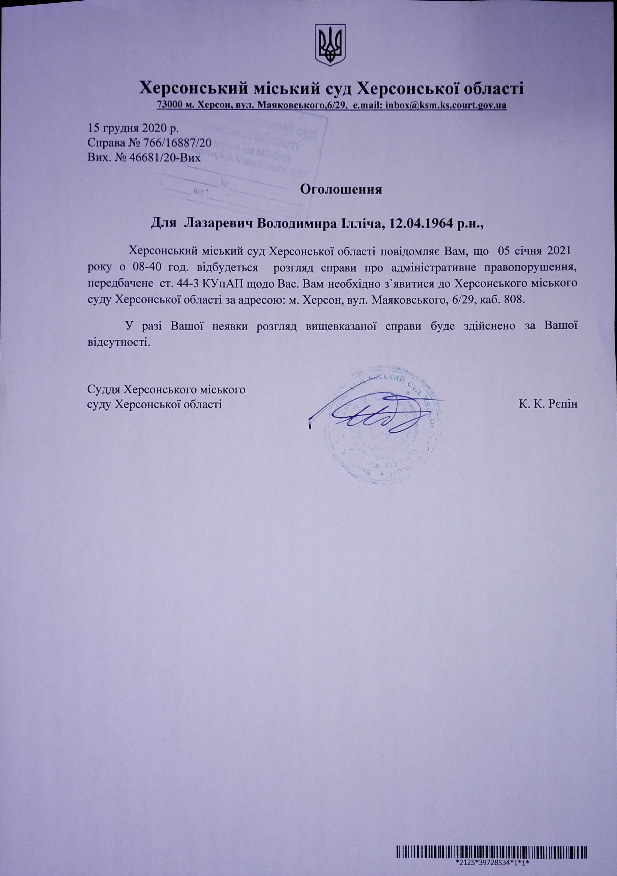 ОГОЛОШЕННЯ для Лазаревич Володимира Ілліча