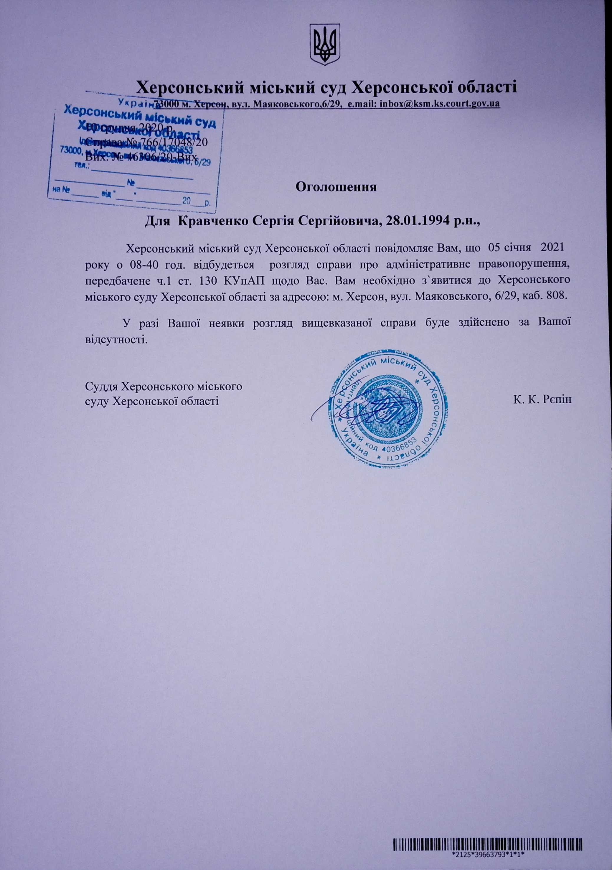 ОГОЛОШЕННЯ для Кравченко Сергія Сергійовича