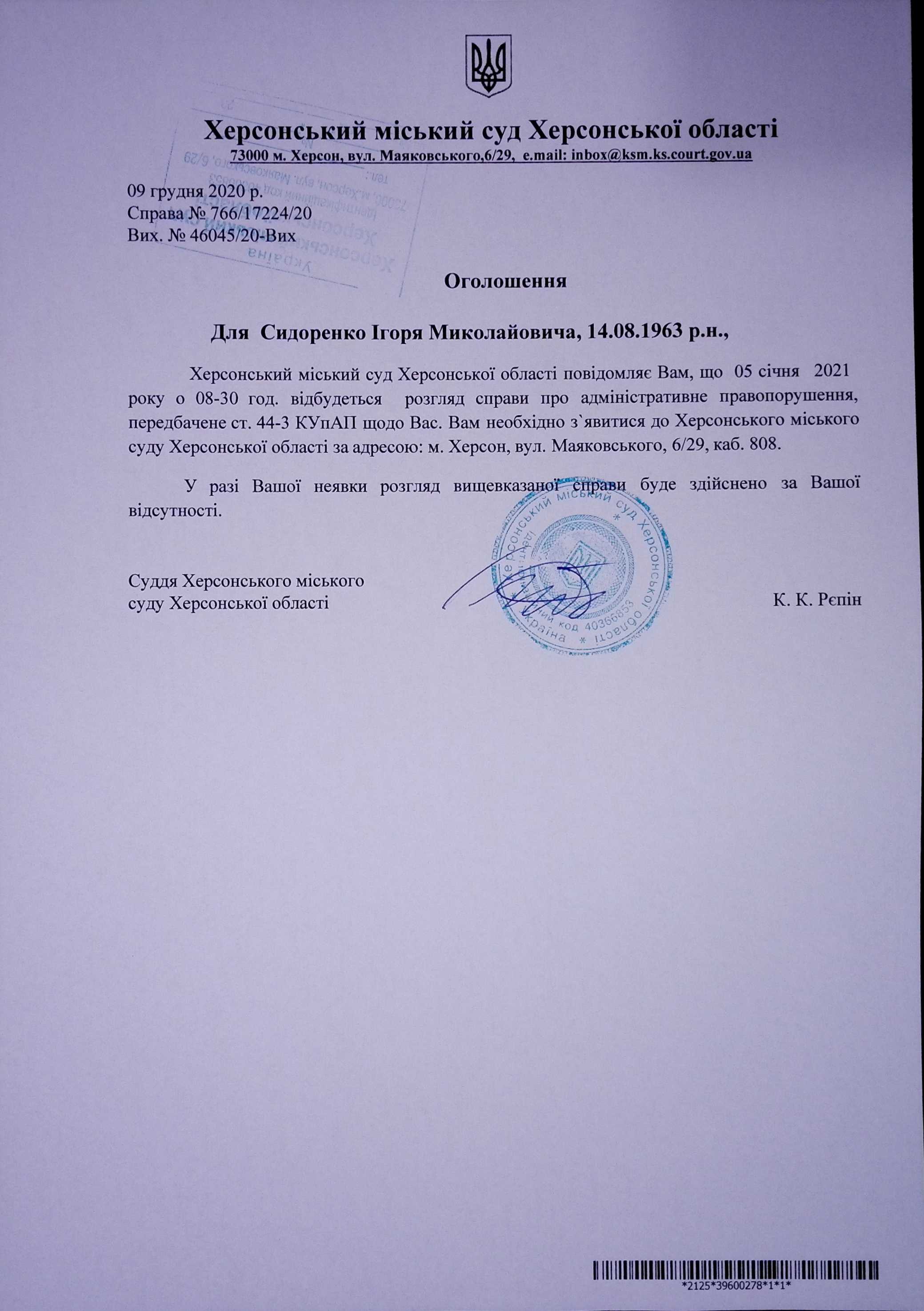 ОГОЛОШЕННЯ ПРО ВИКЛИК ДО СУДУ