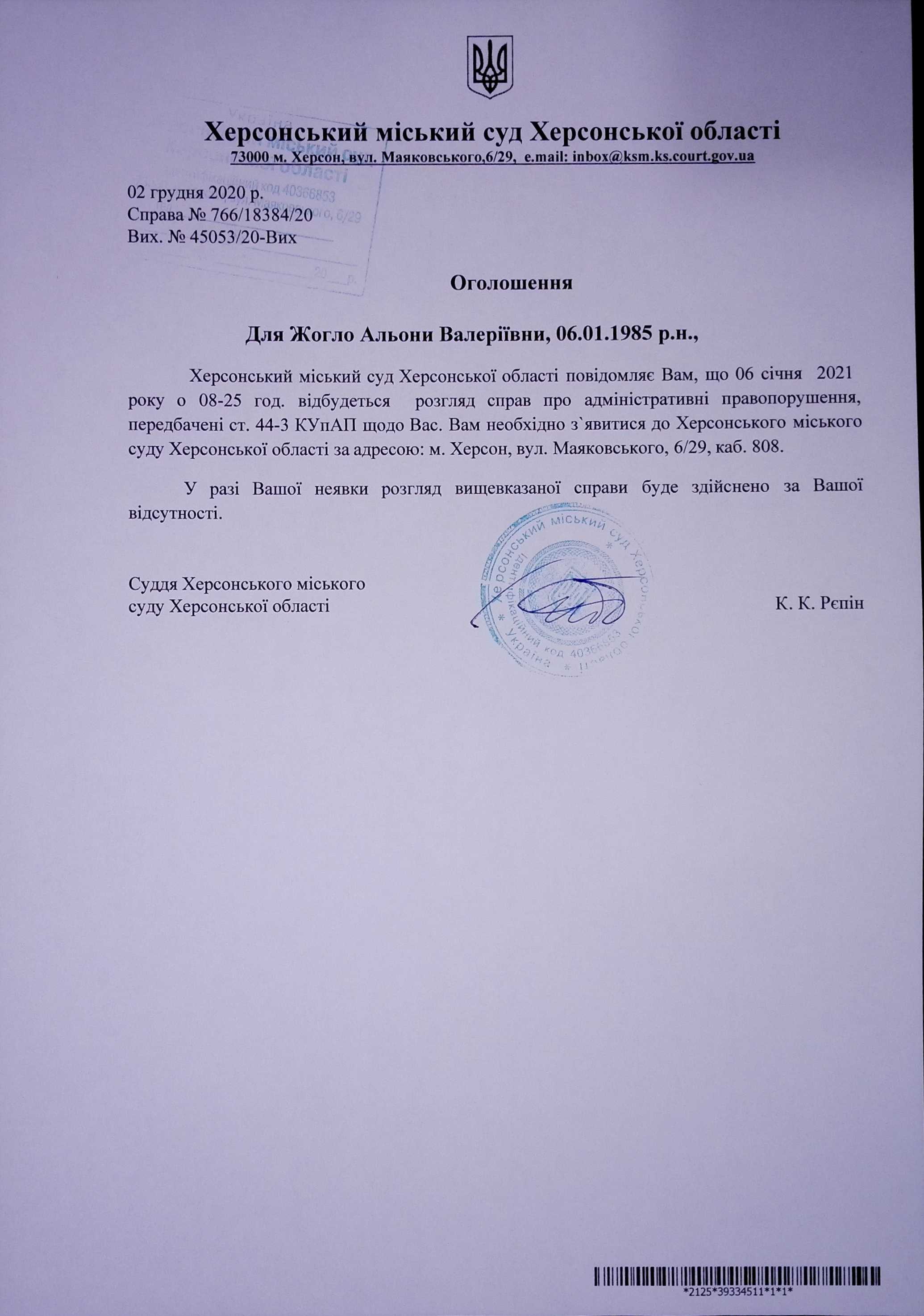 ОГОЛОШЕННЯ для Жогло Альони Валеріївни
