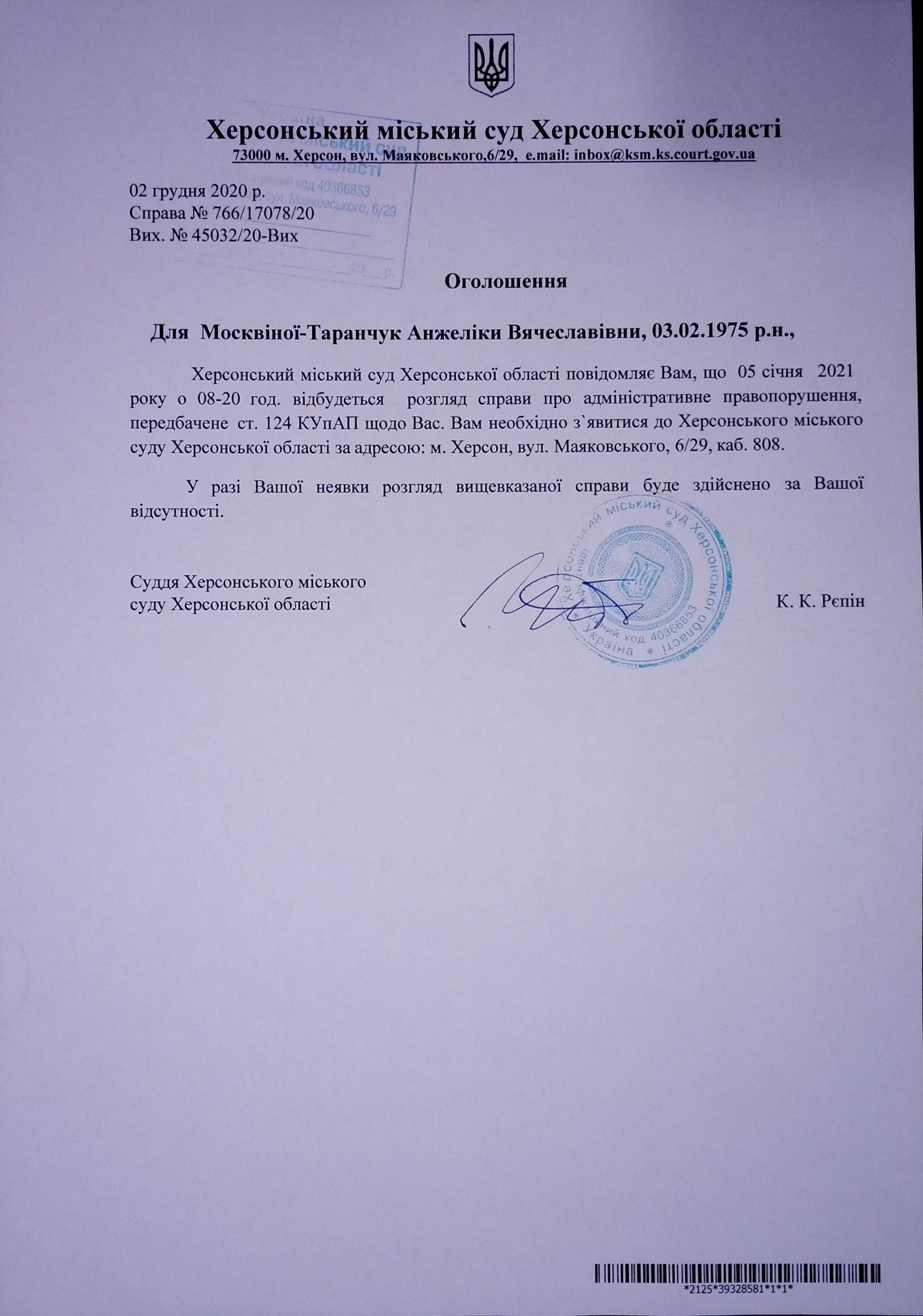 ОГОЛОШЕННЯ для Москвіної - Таранчук Анжеліки Вячеславівни