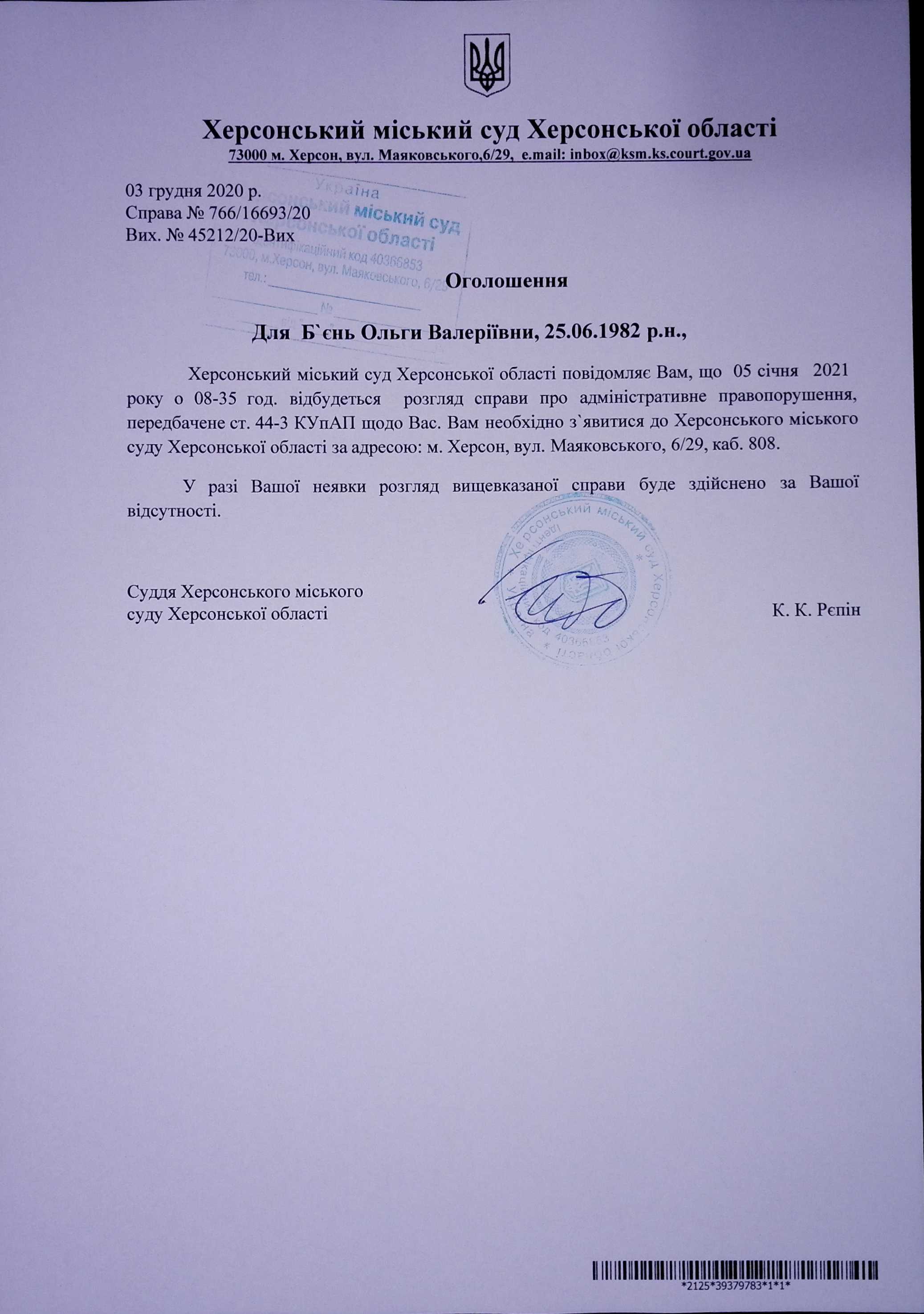 ОГОЛОШЕННЯ ПРО ВИКЛИК ДО СУДУ