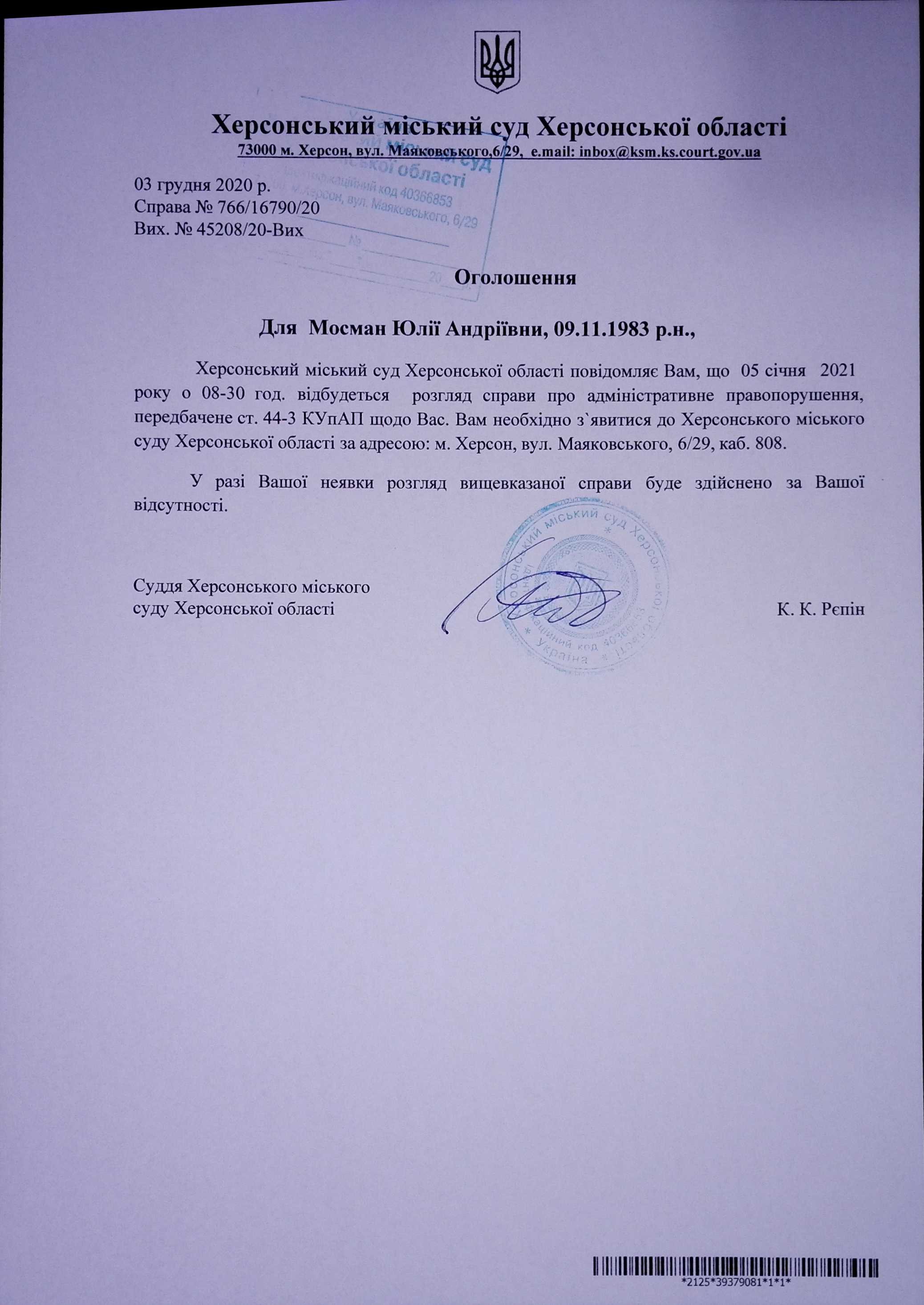 ОГОЛОШЕННЯ для Мосман Юлії Андріївни