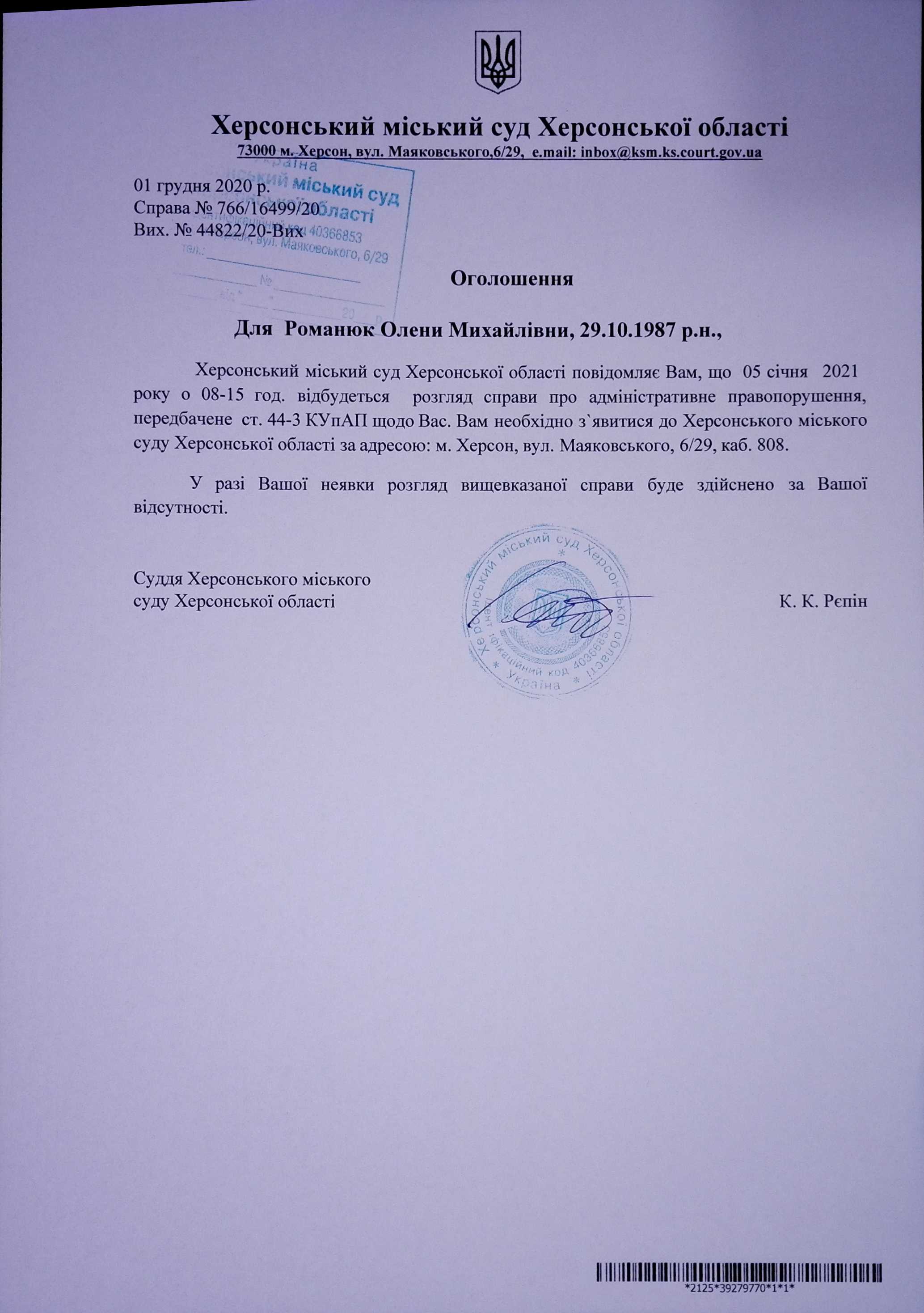 ОГОЛОШЕННЯ ПРО ВИКЛИК ДО СУДУ