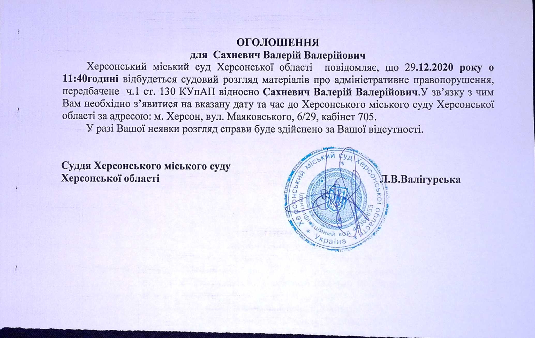 ОГОЛОШЕННЯ для Сахневича Валерія Валерійовича