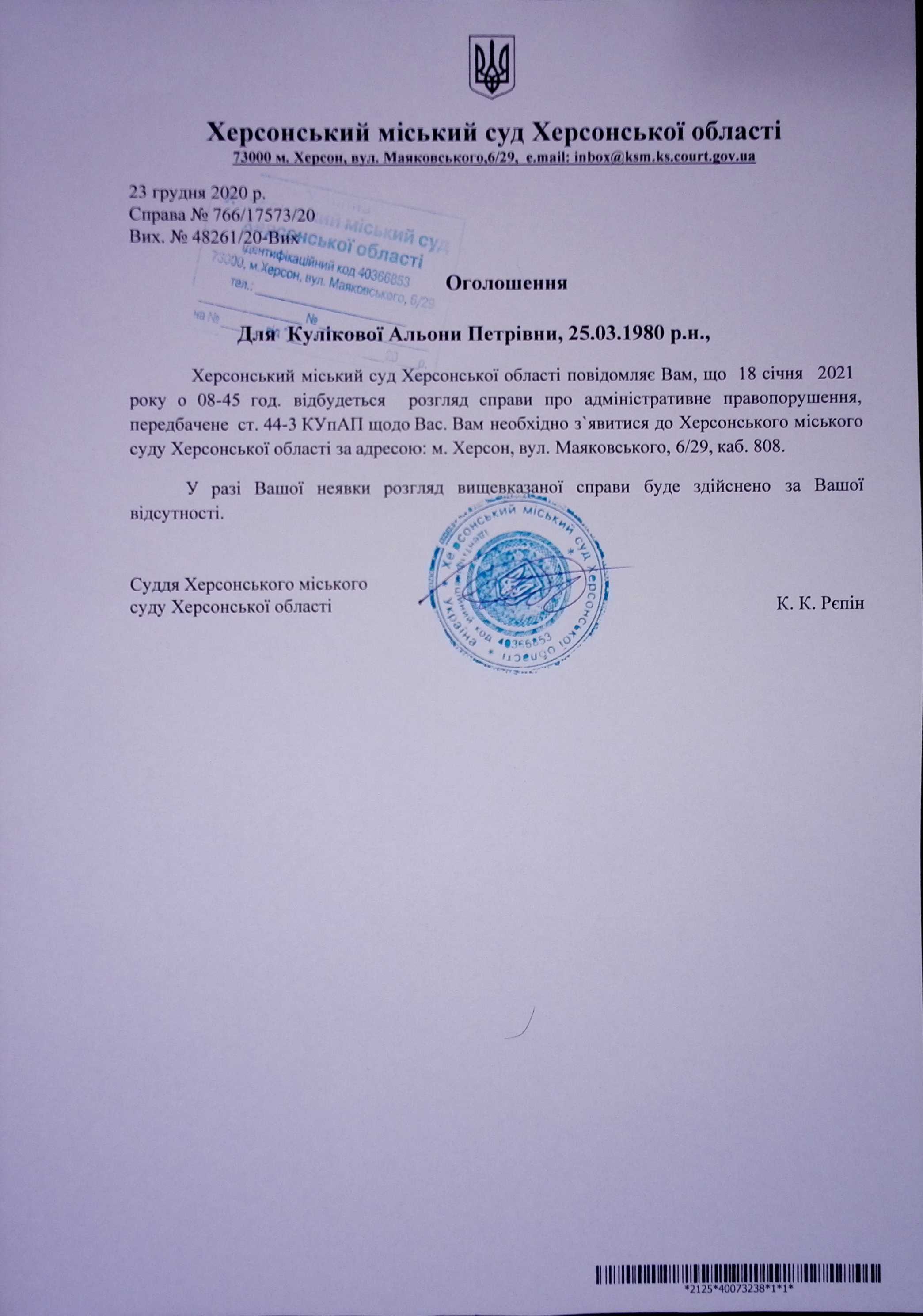 ОГОЛОШЕННЯ для Кулікової Альони Петрівни