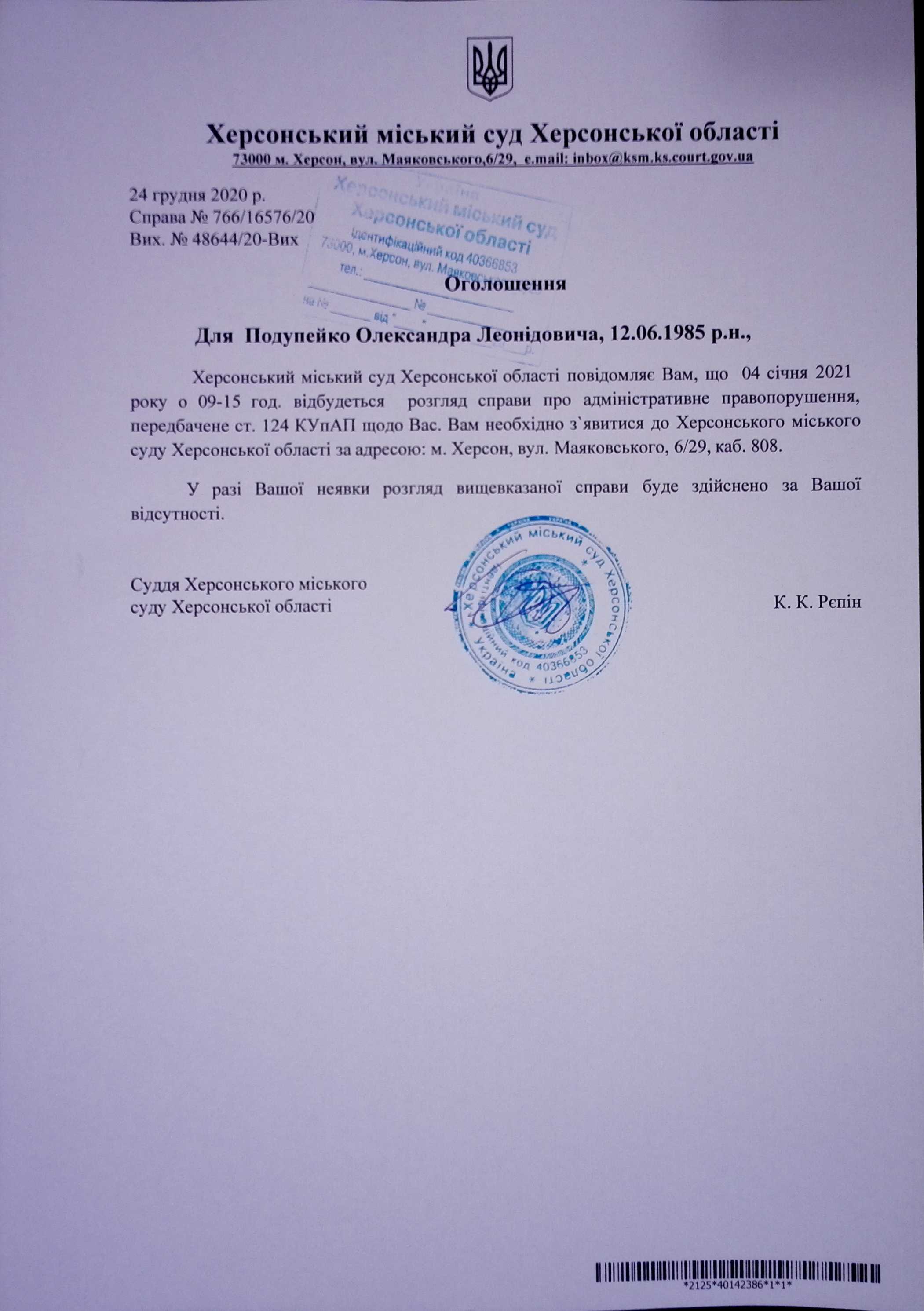 ОГОЛОШЕННЯ для Подупейко Олександра Леонідовича