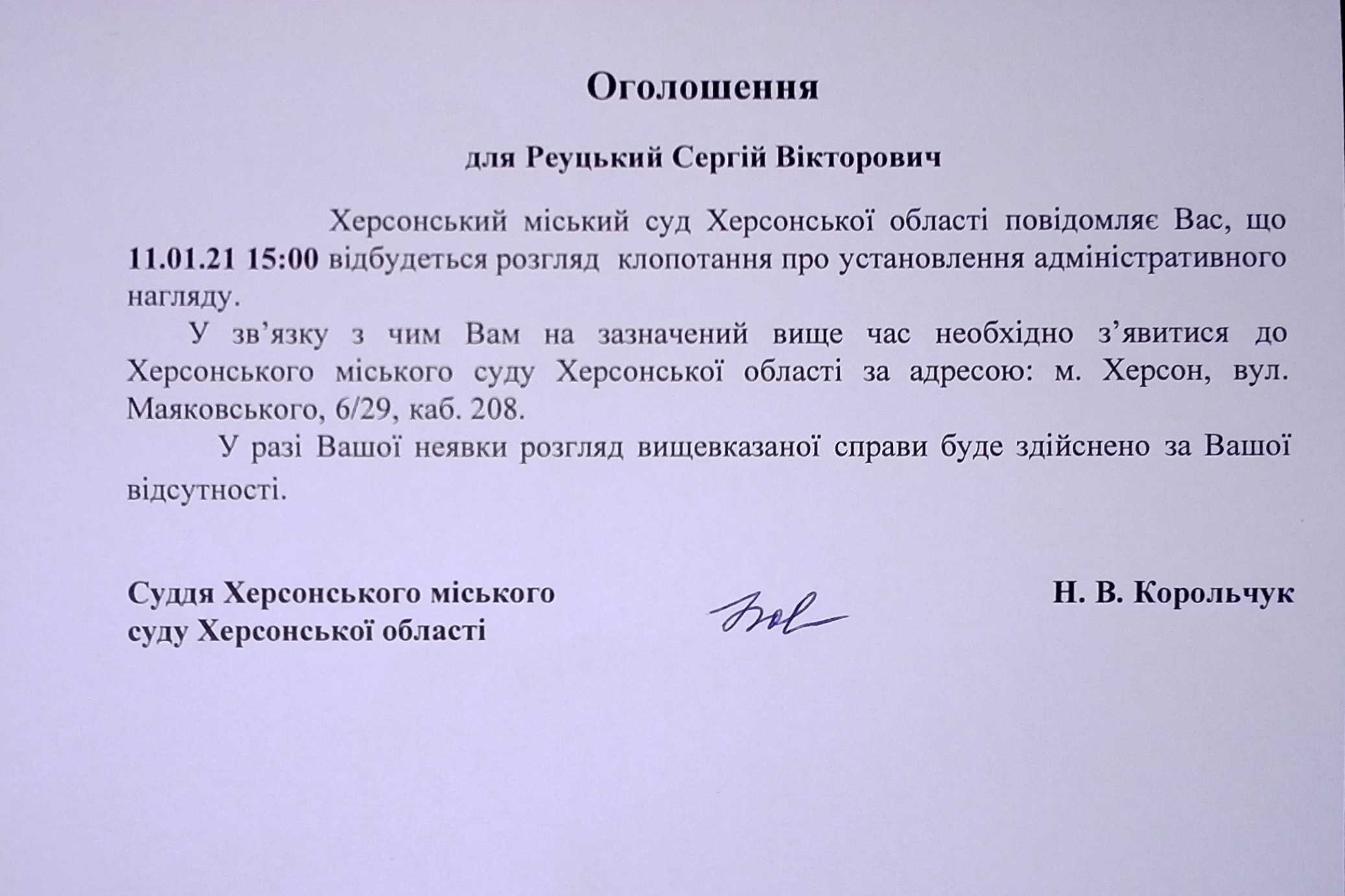 ОГОЛОШЕННЯ для Реуцького Сергія Вікторовича