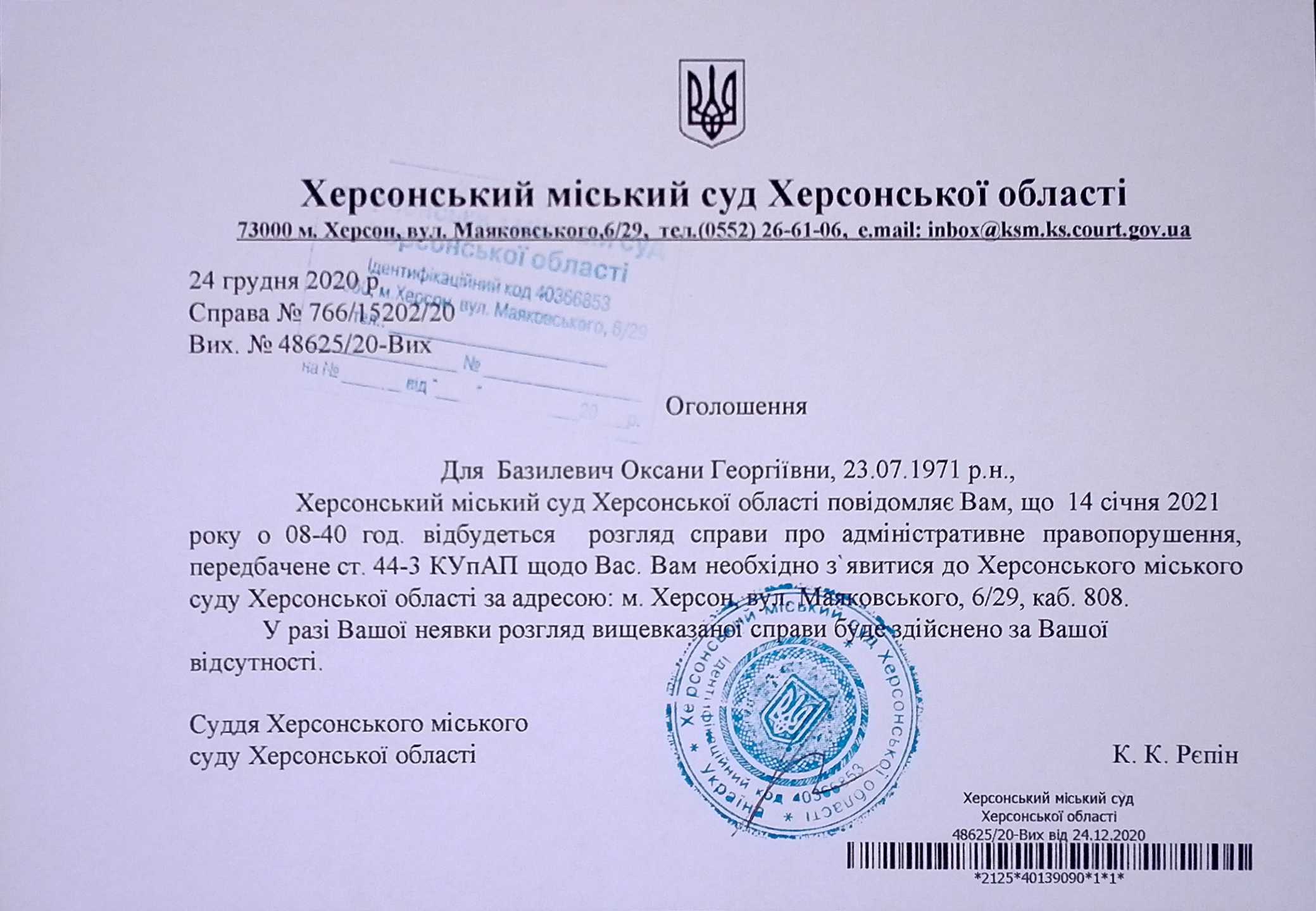 ОГОЛОШЕННЯ ПРО ВИКЛИК ДО СУДУ