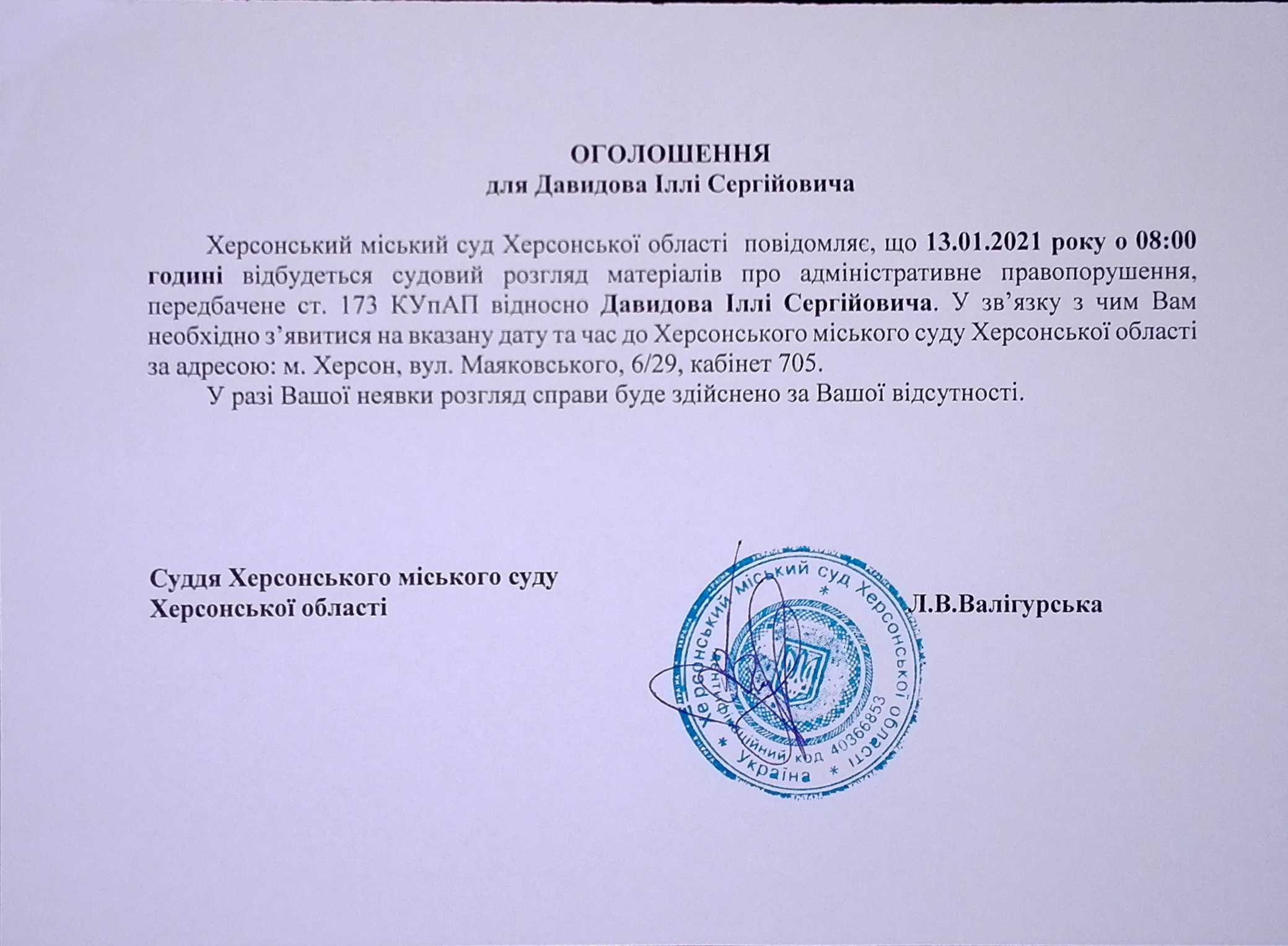ОГОЛОШЕННЯ для Давидова Іллі Сергійовича