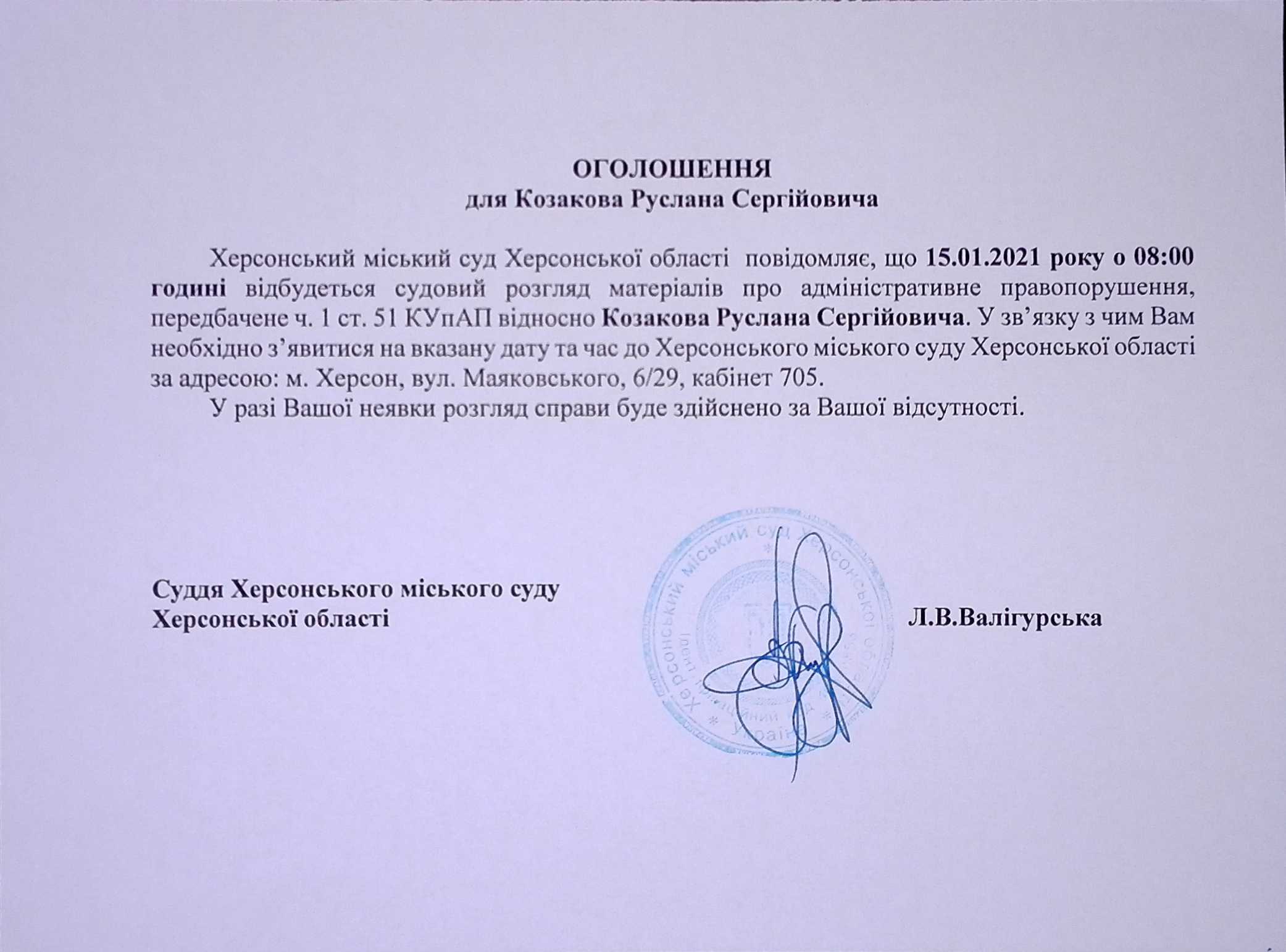 ОГОЛОШЕННЯ для Козакова Руслана Сергійовича