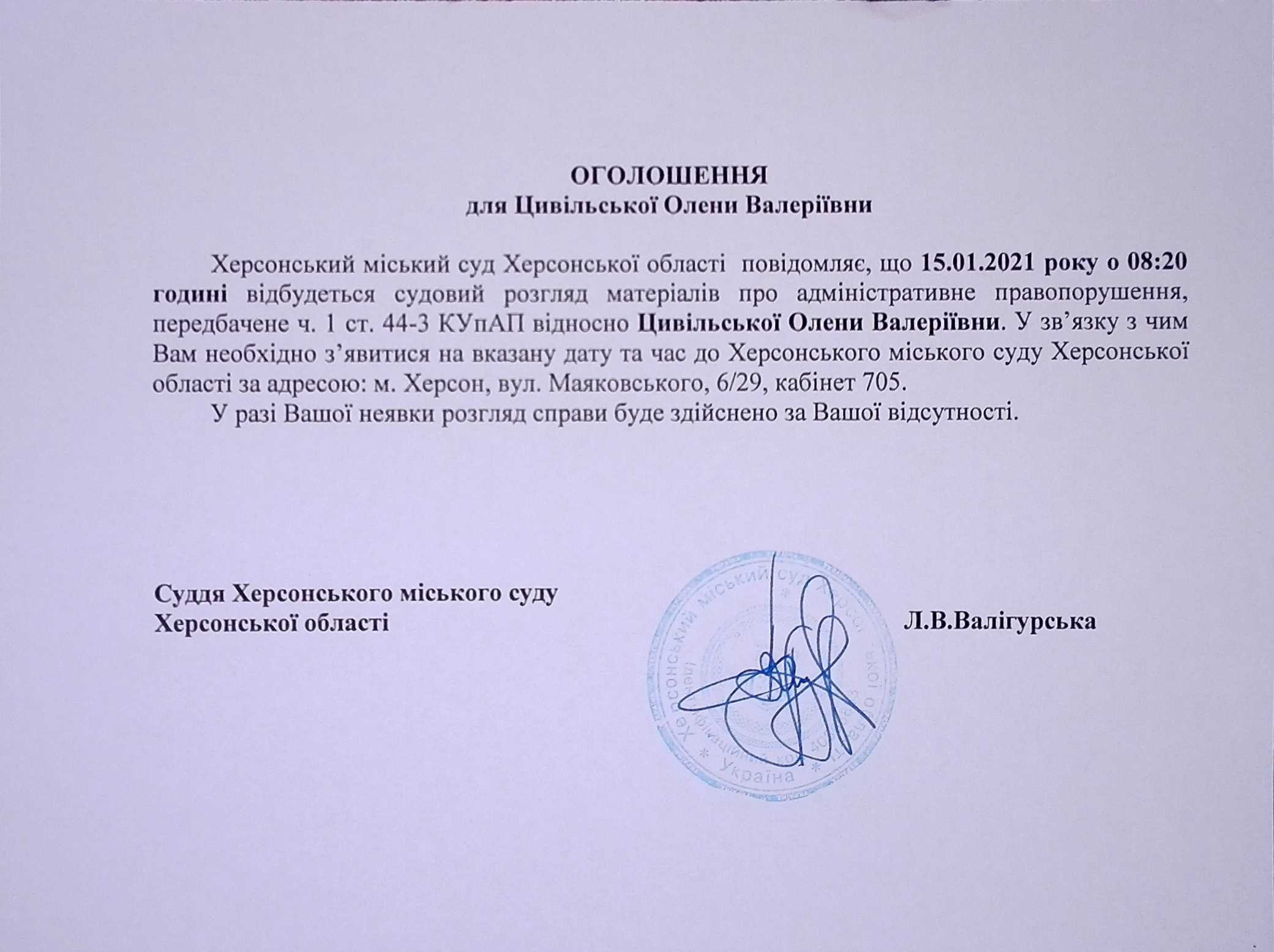 ОГОЛОШЕННЯ для Цивільської Олени Валеріївни