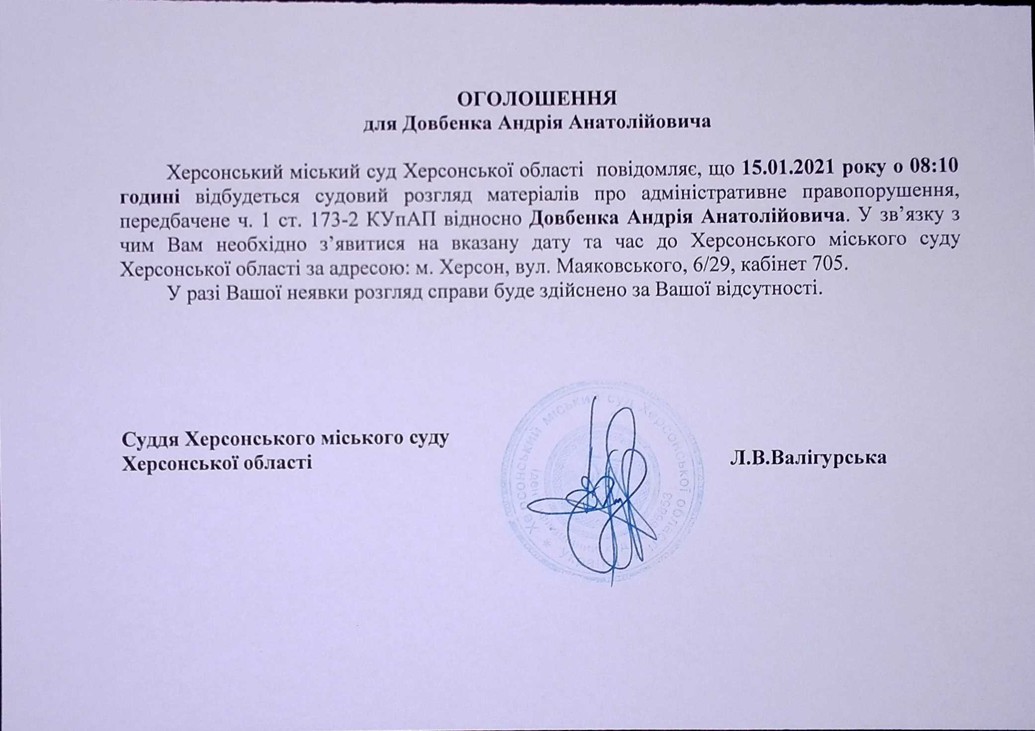 ОГОЛОШЕННЯ для Довбенка Андрія Анатолійовича