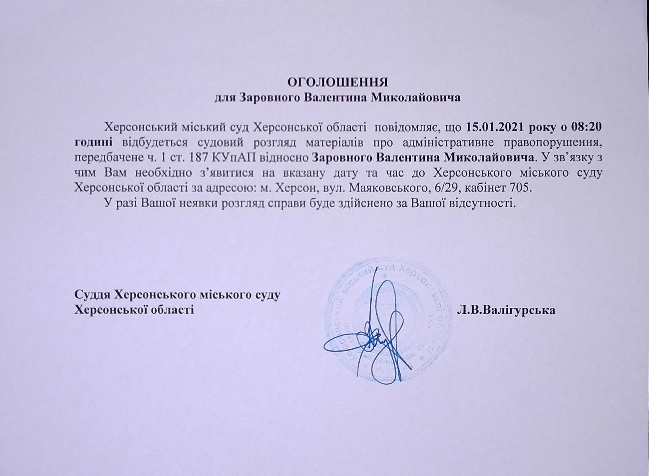 ОГОЛОШЕННЯ для Заровного Валентина Миколайовича