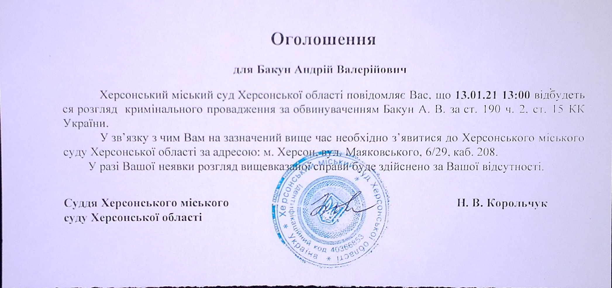 ОГОЛОШЕННЯ ПРО ВИКЛИК ДО СУДУ