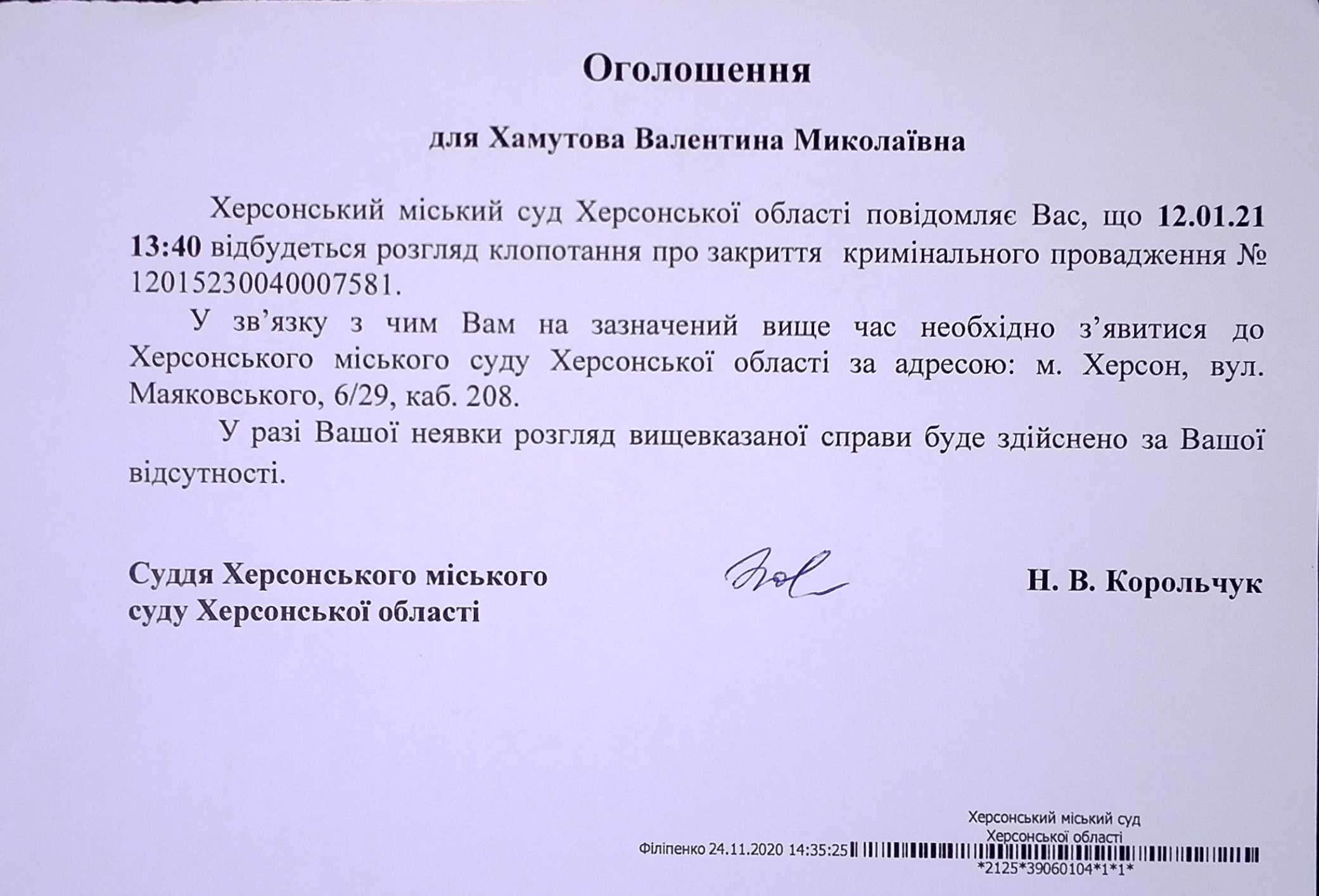 ОГОЛОШЕННЯ для Хамутова Валентина Ммколаївна