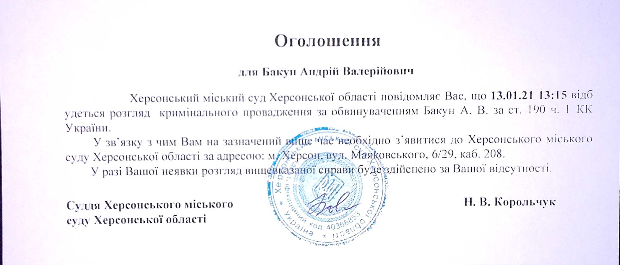 ОГОЛОШЕННЯ ПРО ВИКЛИК ДО СУДУ