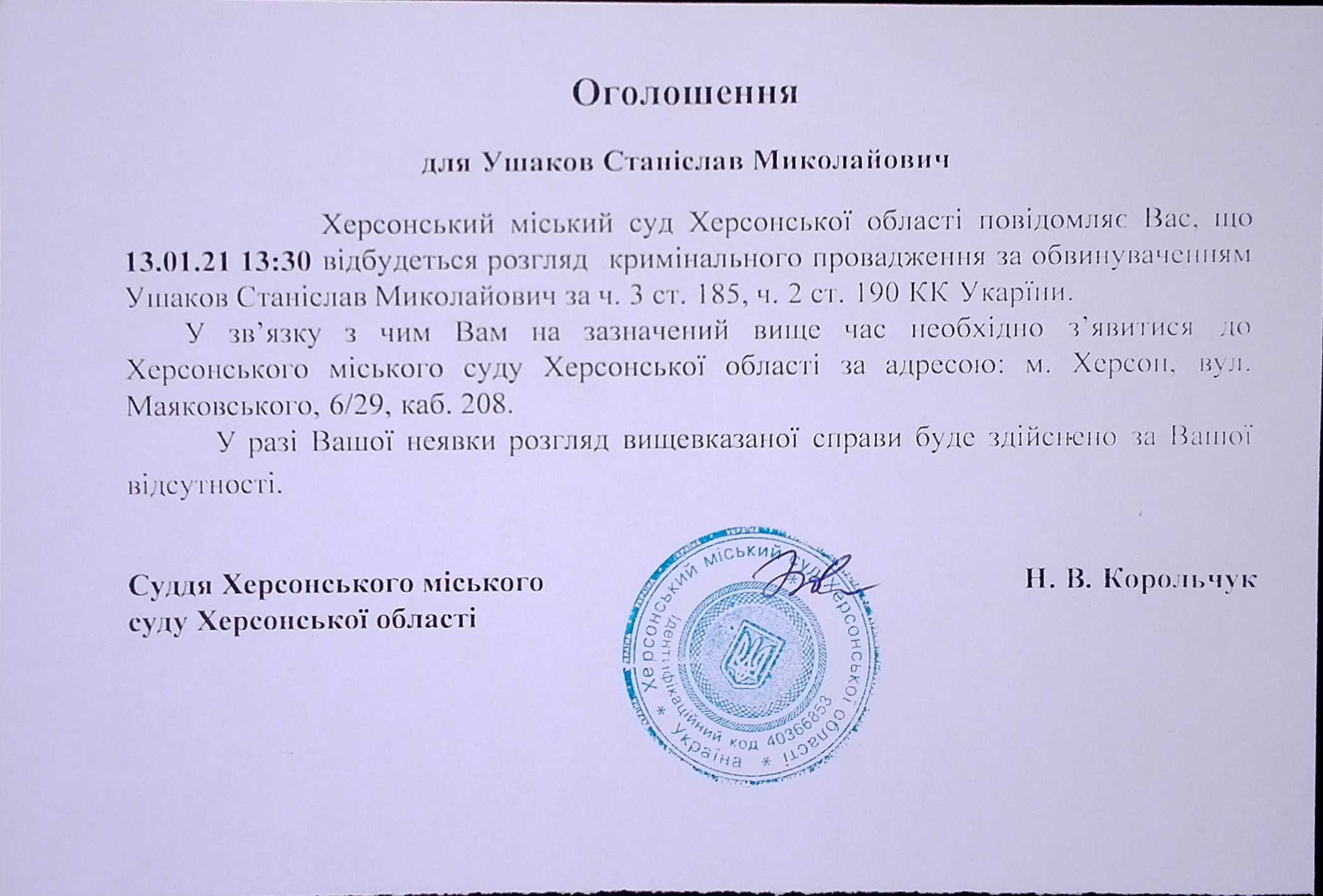 ОГОЛОШЕННЯ для Ушакова Станіслава Миколайовича
