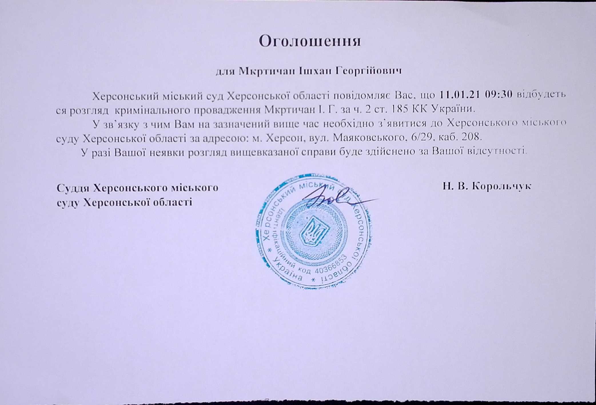 ОГОЛОШЕННЯ для Мкртичан Іщхан Георгійовича