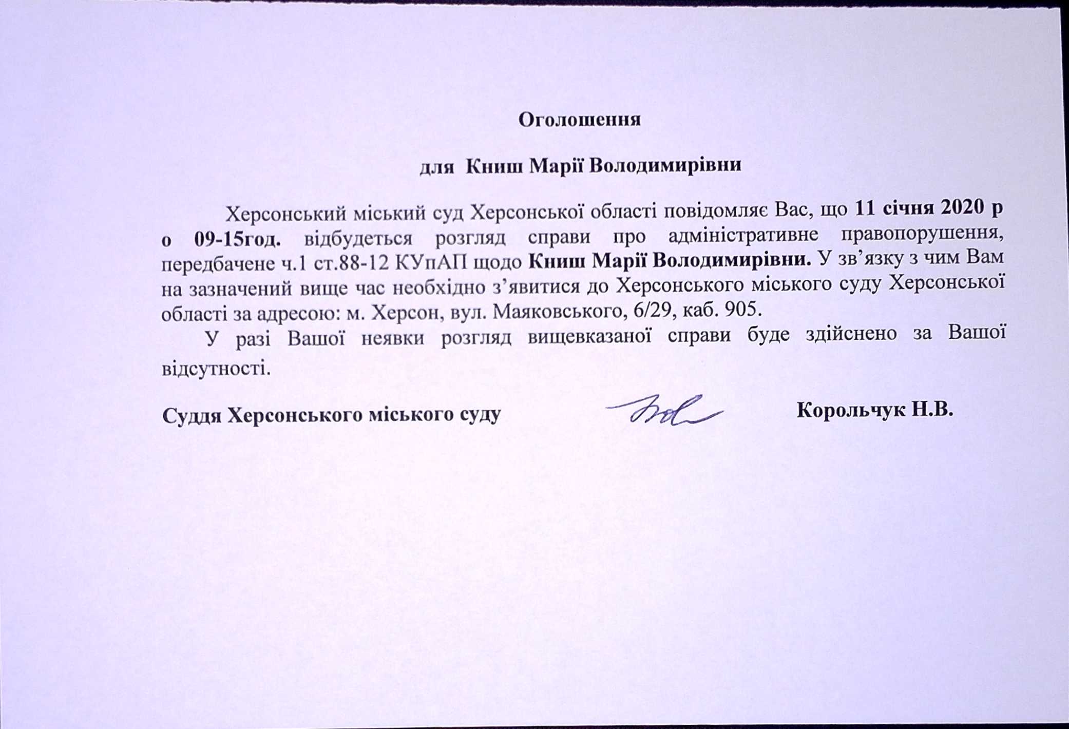 ОГОЛОШЕННЯ ПРО ВИКЛИК ДО СУДУ