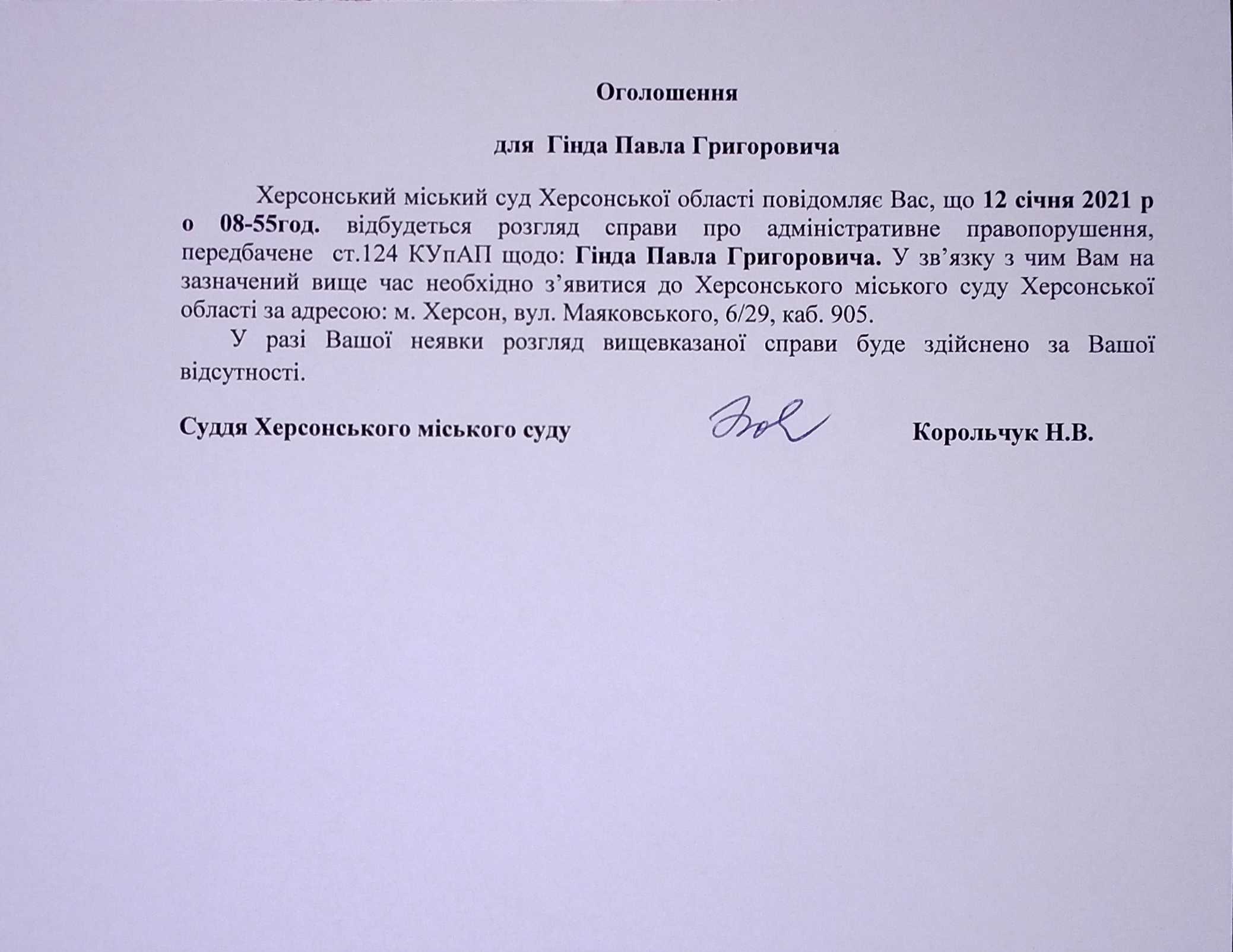 ОГОЛОШЕННЯ ПРО ВИКЛИК ДО СУДУ