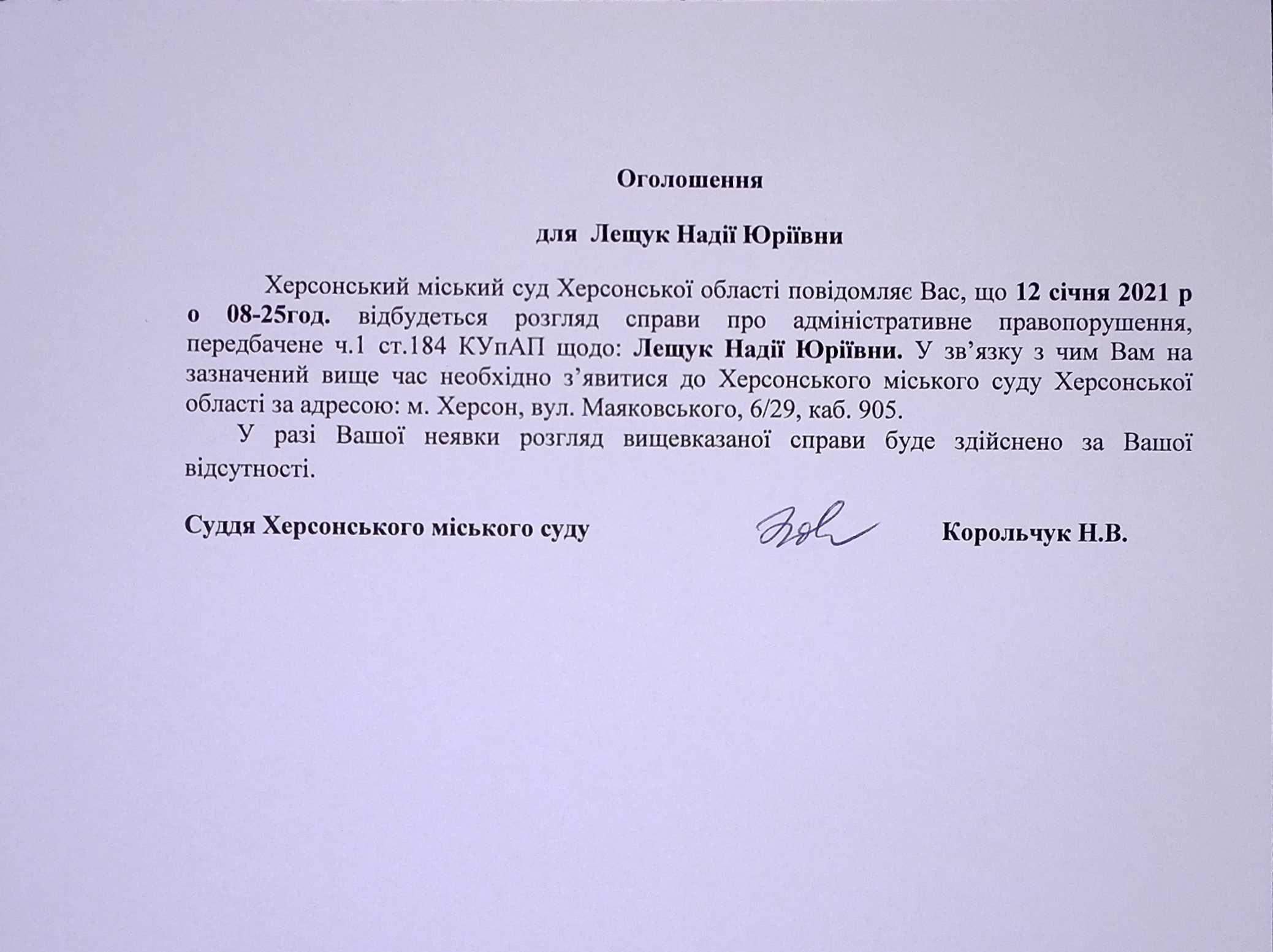 ОГОЛОШЕННЯ для Лещук Надії Юріївни