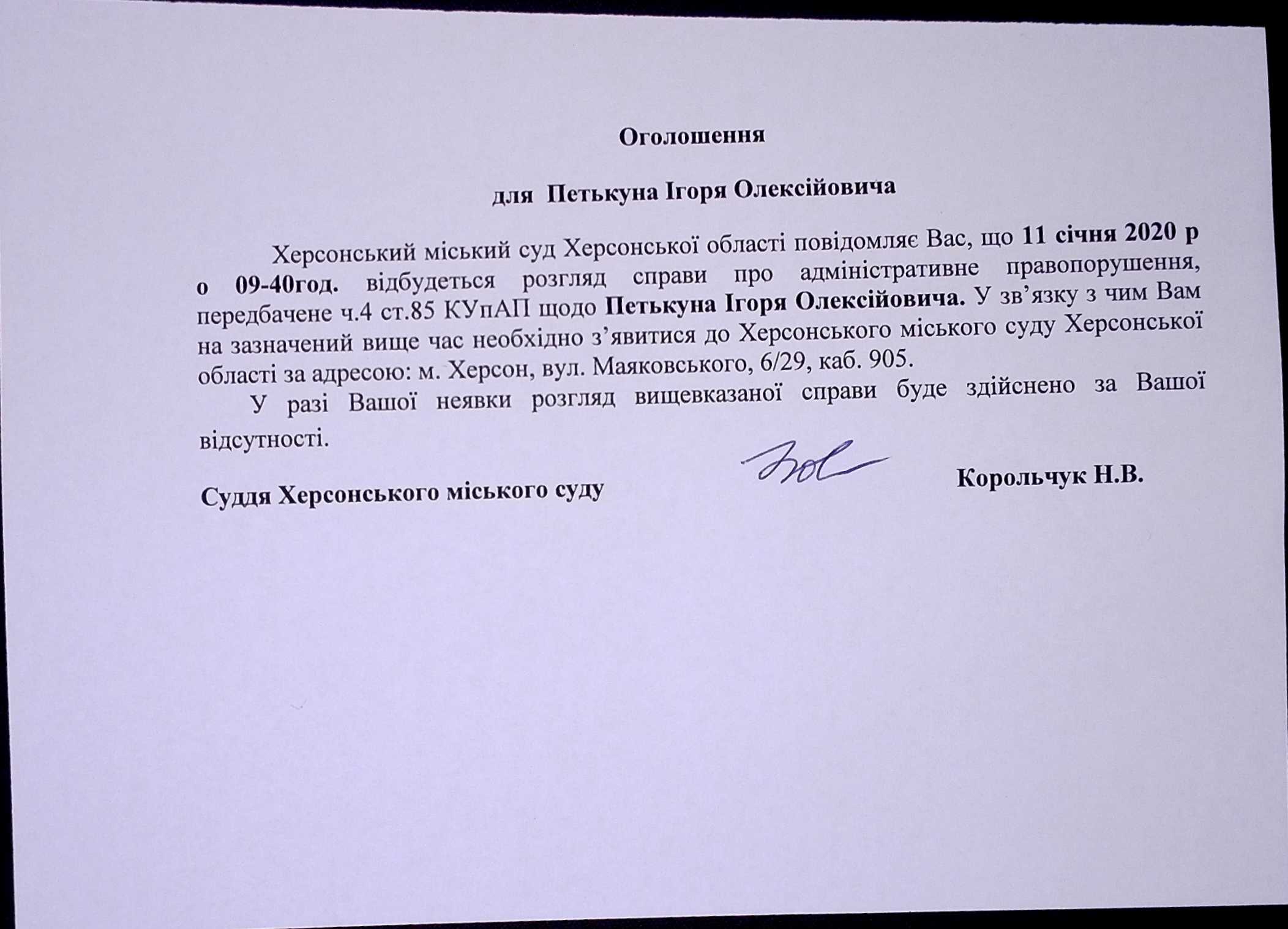 ОГОЛОШЕННЯ ПРО ВИКЛИК ДО СУДУ