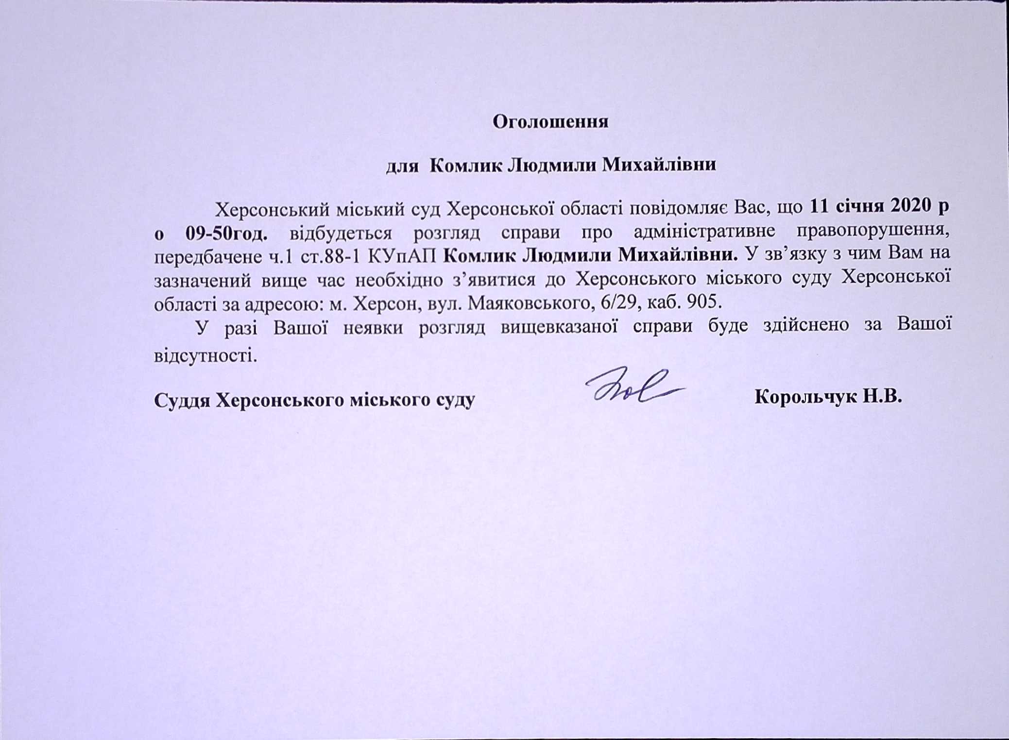 ОГОЛОШЕННЯ для Комлик Людмили Михайлівни