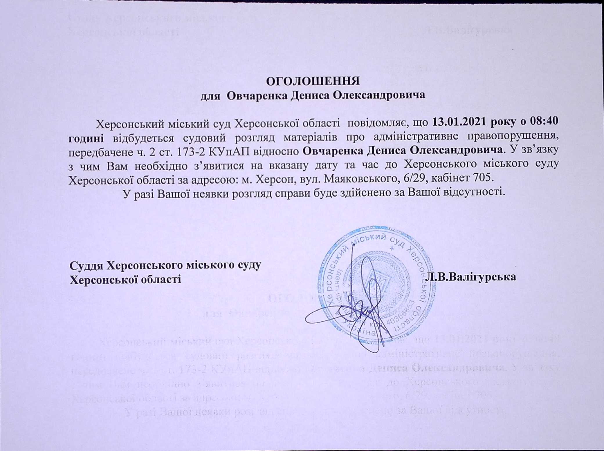 ОГОЛОШЕННЯ для Овчаренка Дениса Олександровича
