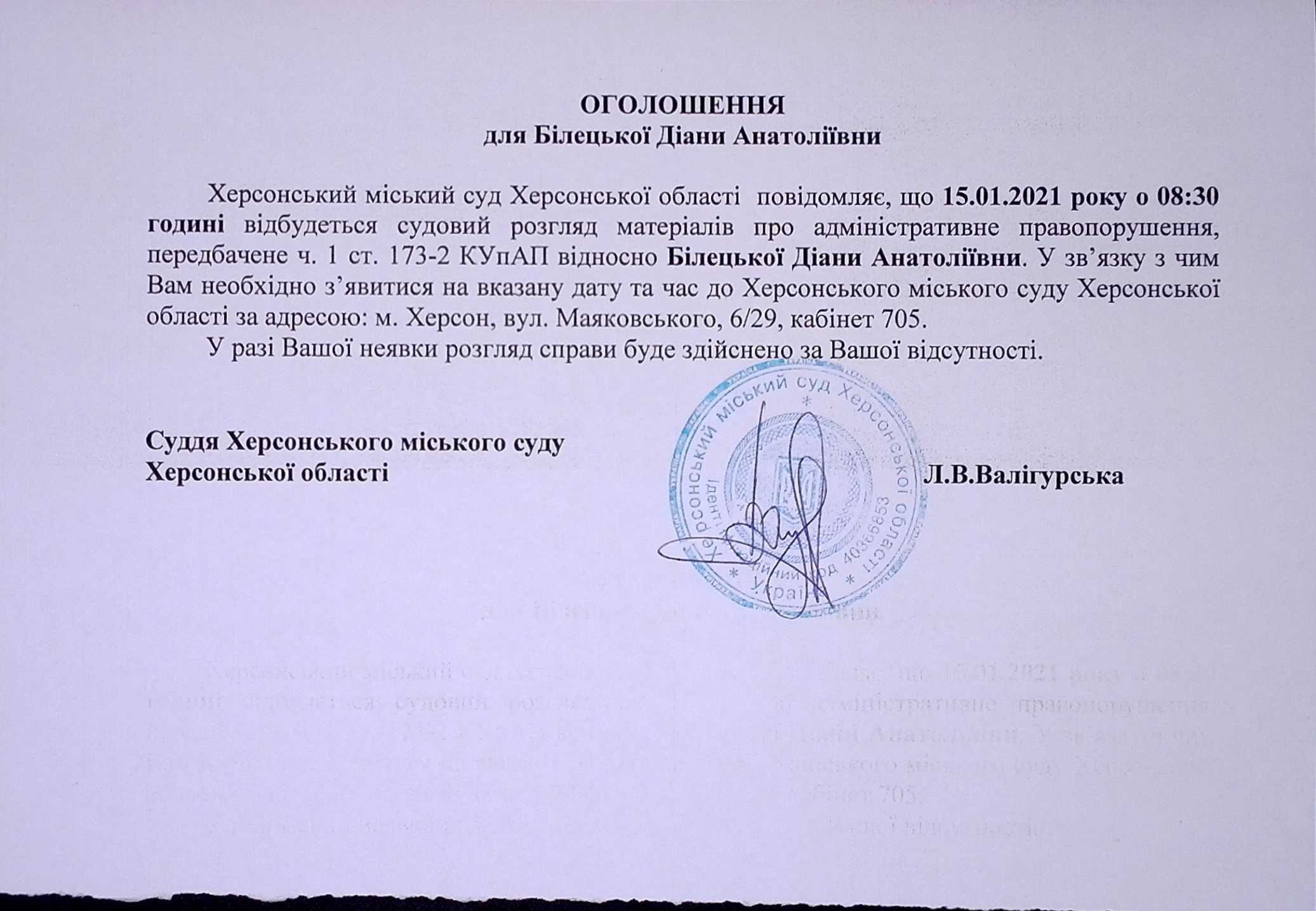 ОГОЛОШЕННЯ для Білецької Діани Анатоліївни