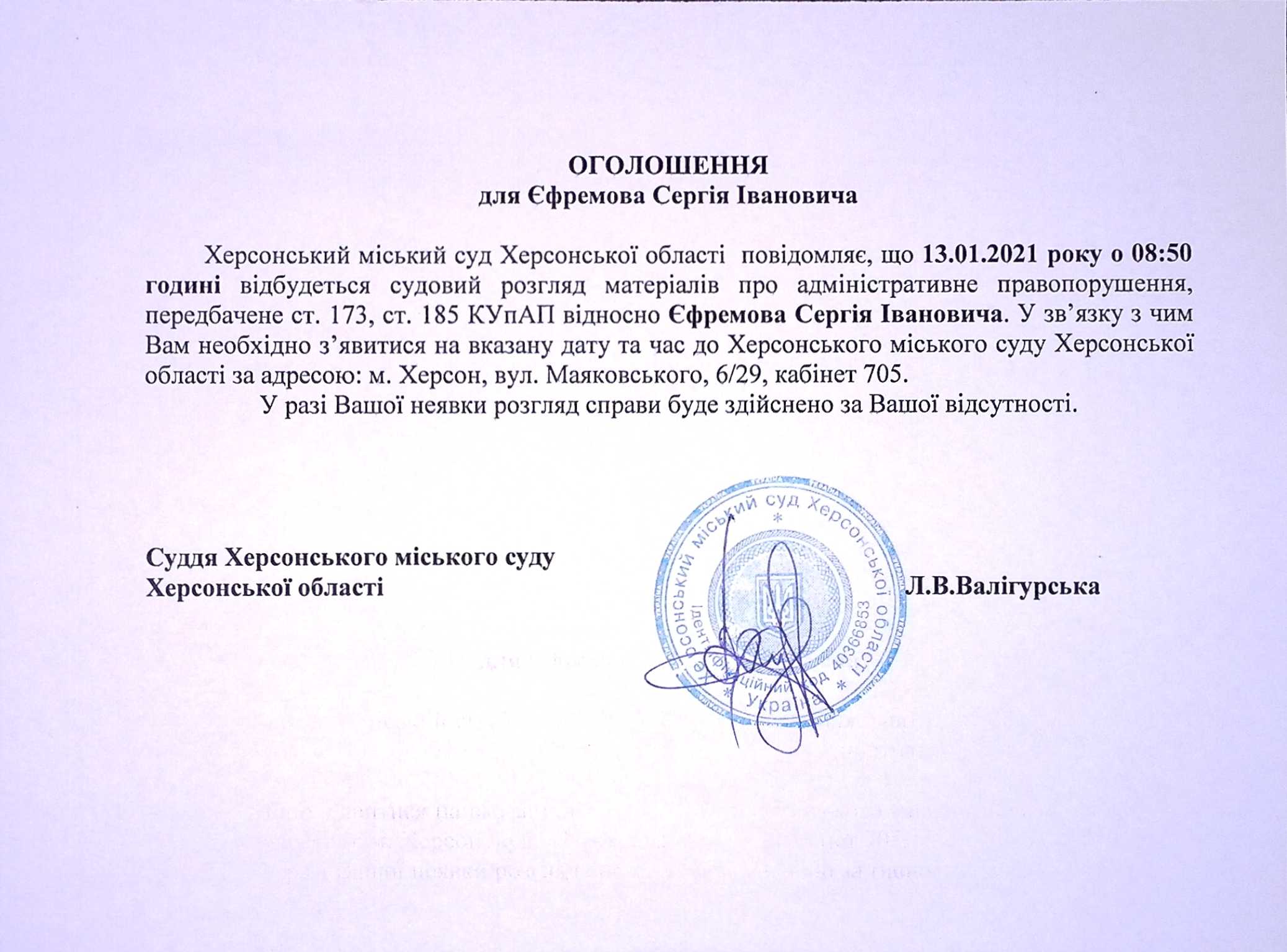 ОГОЛОШЕННЯ для Єфремова Сергія Івановича