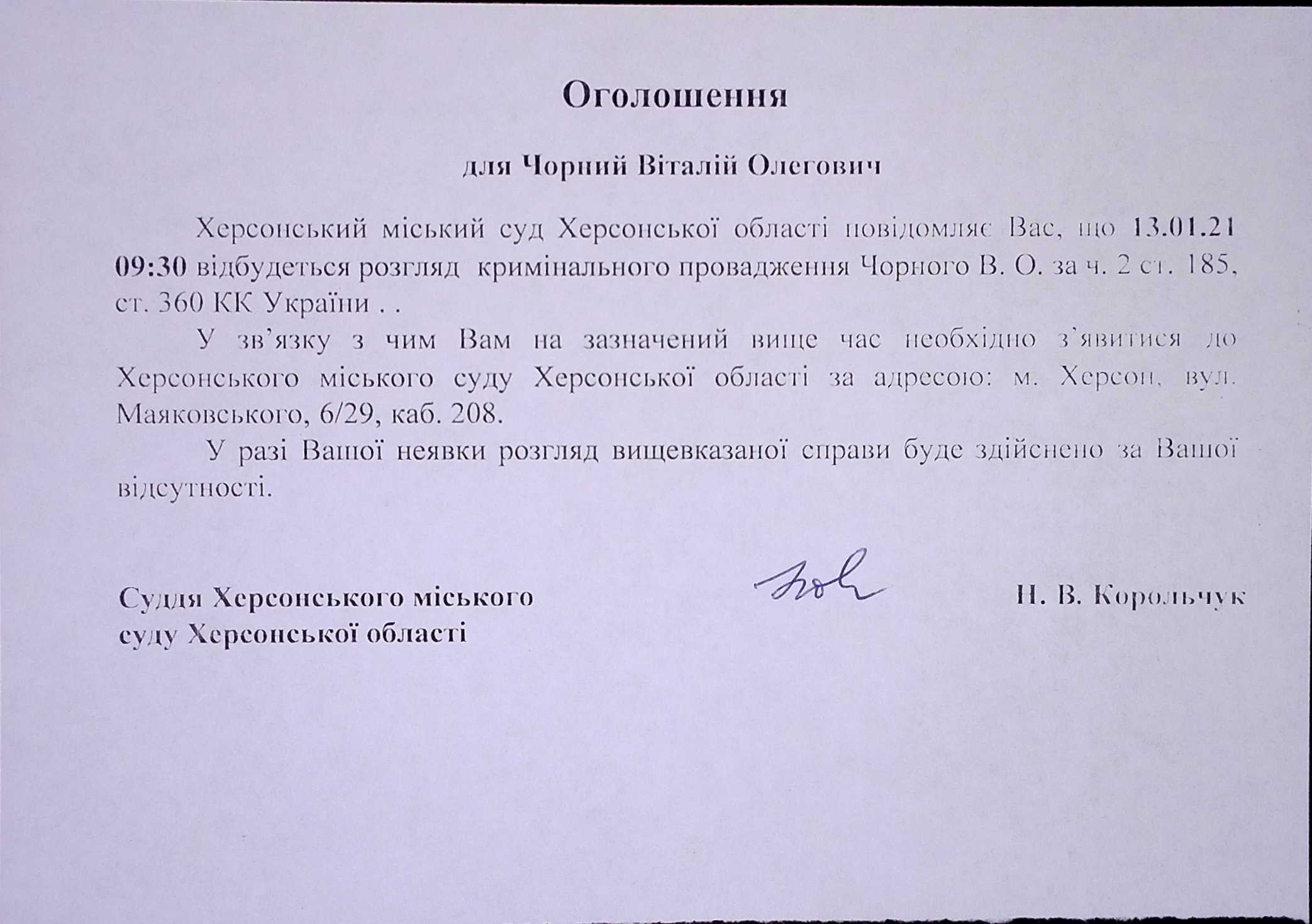 ОГОЛОШЕННЯ для Чорного Віталія Олеговича
