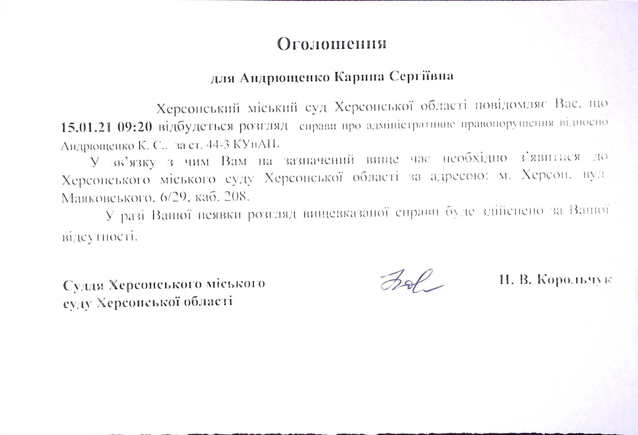 ОГОЛОШЕННЯ для Андрющенко Карини Сергіївни