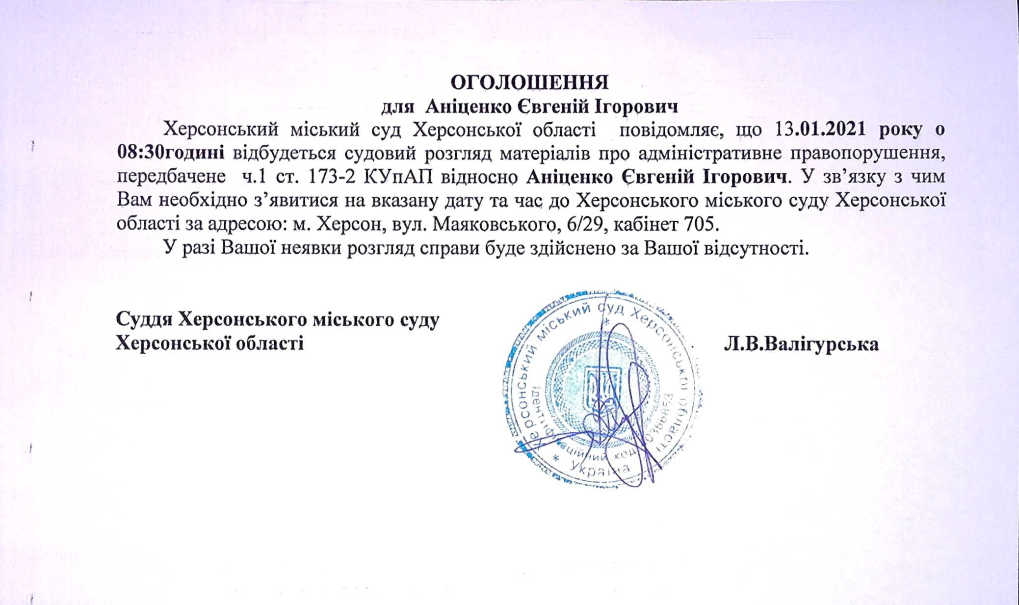ОГОЛОШЕННЯ для Аніценко Євгенія Ігоровича