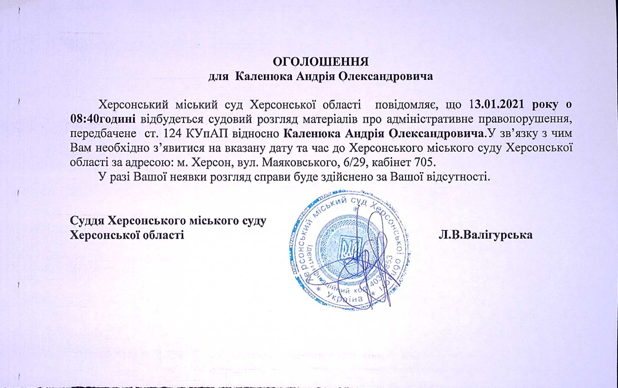 ОГОЛОШЕННЯ для Каленюка Андрія Олександровича