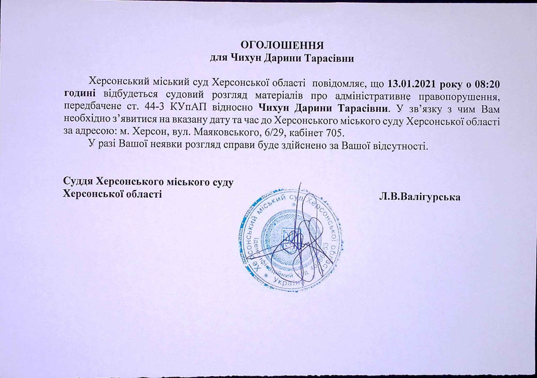 ОГОЛОШЕННЯ для Чихун Дарини Тарасівни