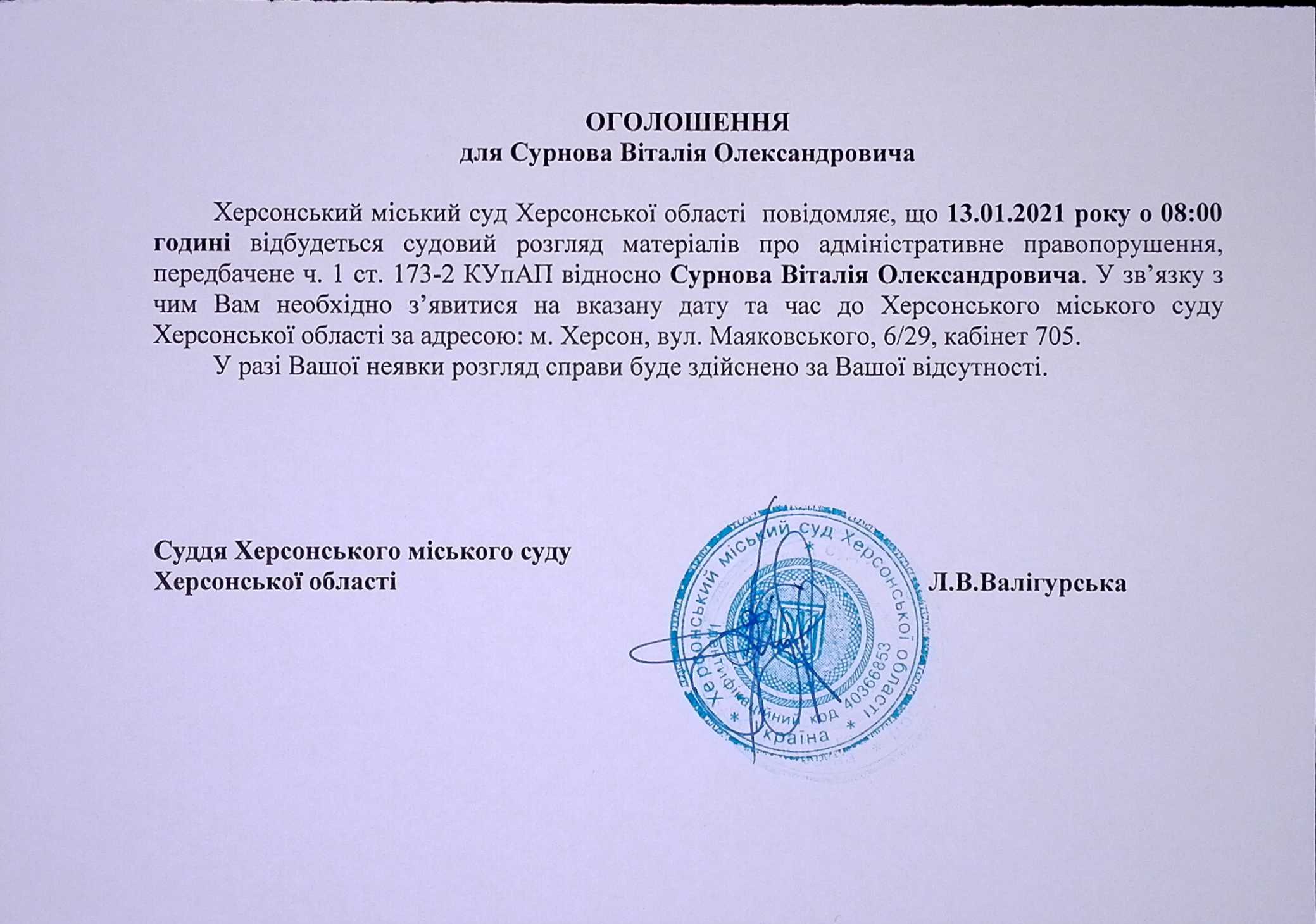 ОГОЛОШЕННЯ для Сурнова Віталія Олександровича
