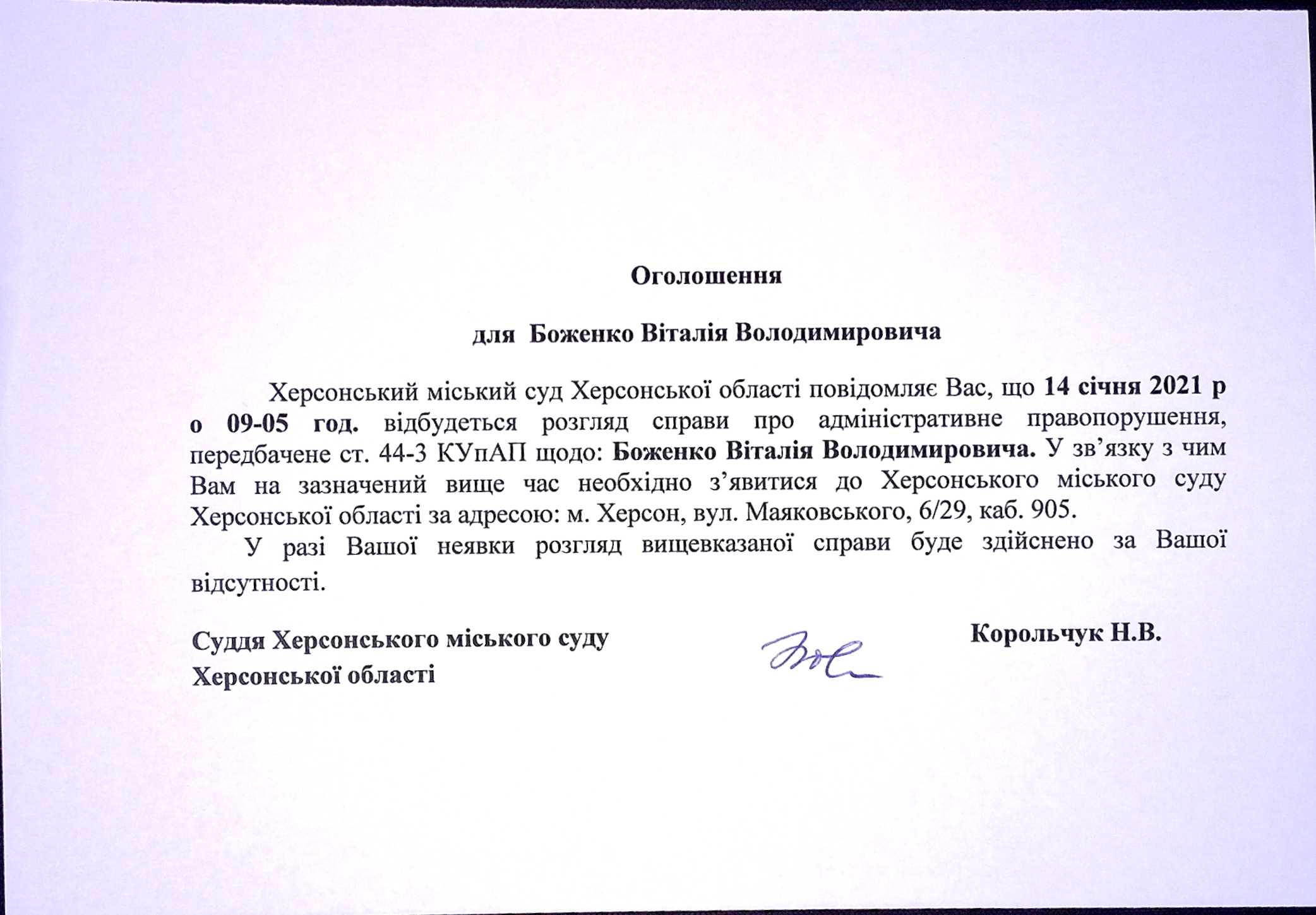 ОГОЛОШЕННЯ ПРО ВИКЛИК ДО СУДУ