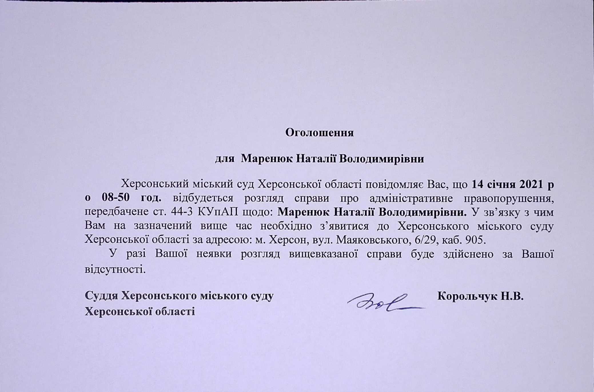ОГОЛОШЕННЯ для Маренюк Наталії Володимирівни